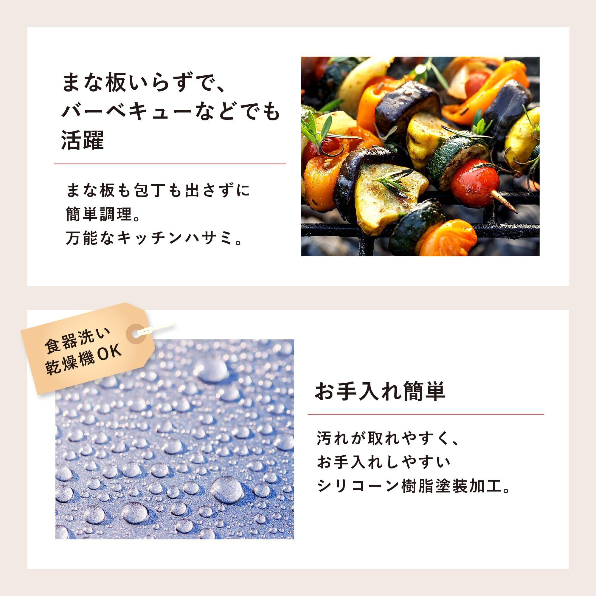 素材・材質:刃/ステンレス刃物鋼、ビス/ステンレススチール、ビスキャップ/ポリプロピレン、ハンドル/エラストマー樹脂
