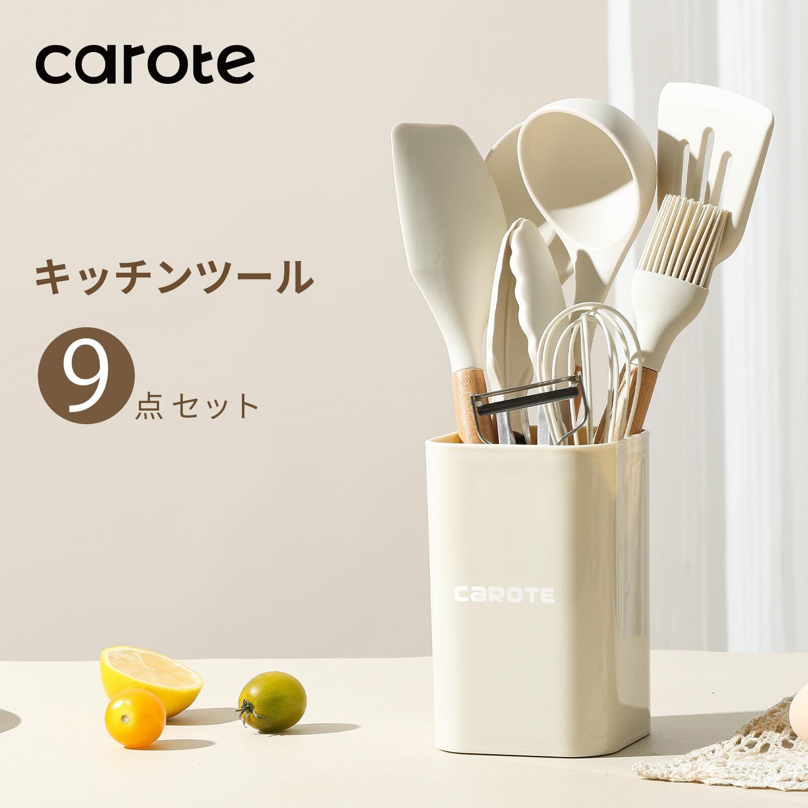 CAROTE カローテ キッチンツールセット9本 シリコン製 調理器具セット フライ返し おたま トング 泡立て器 へら ハケ スプーン浅 ピーラー ツールスタンド 高耐熱性 ベージュ(9点セット)