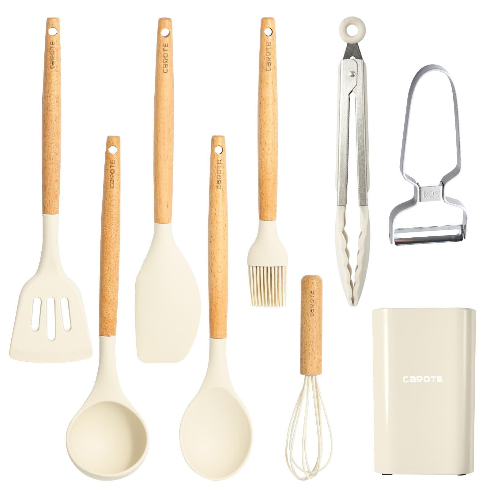 【2022最新】CAROTE カローテ キッチンツールセット9本 シリコン製 調理器具セット フライ返し おたま トング 泡立て器 へら ハケ スプーン浅 ピーラー ツールスタンド 高耐熱性 ベージュ(9点セット)