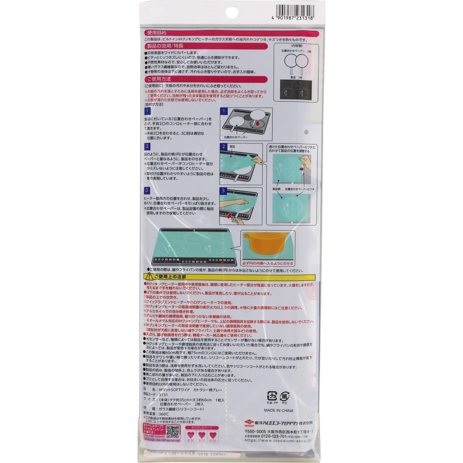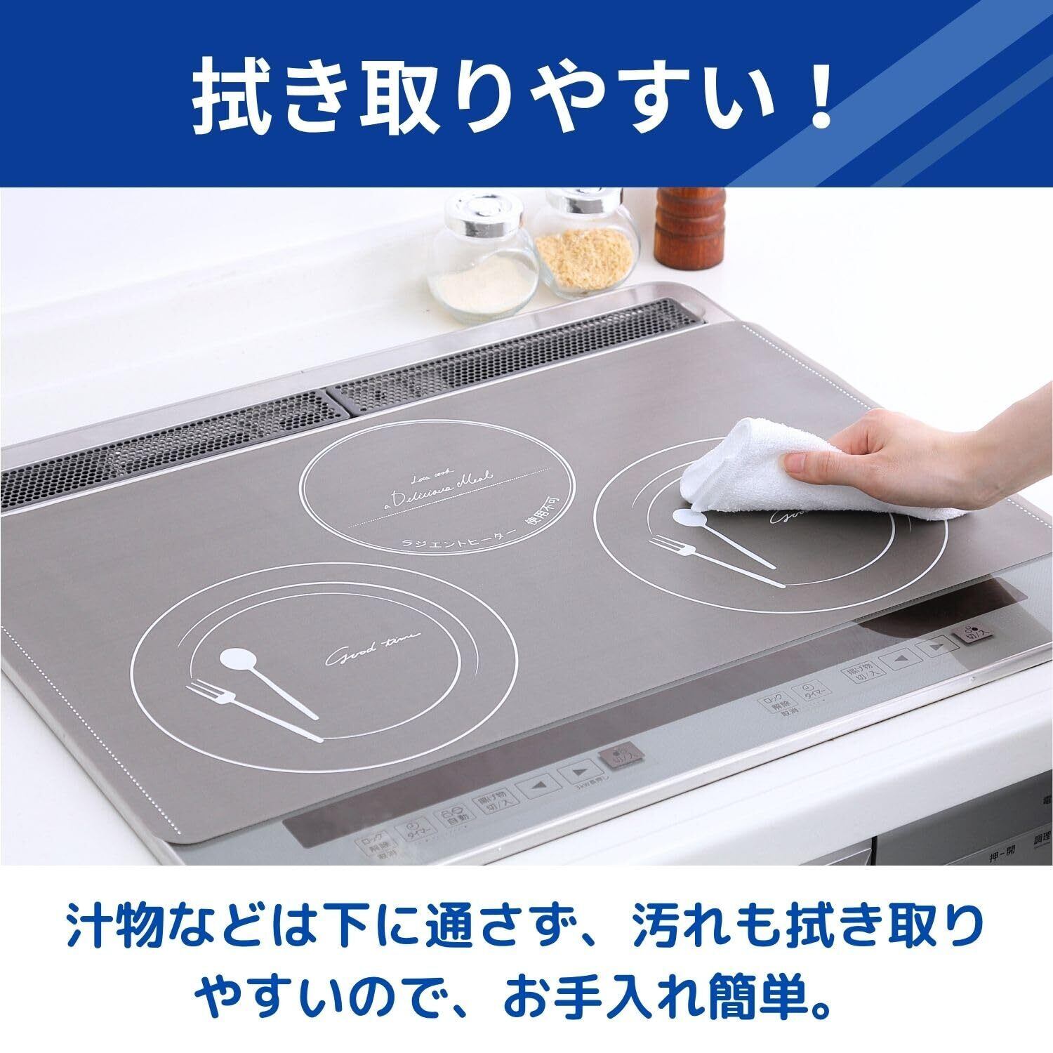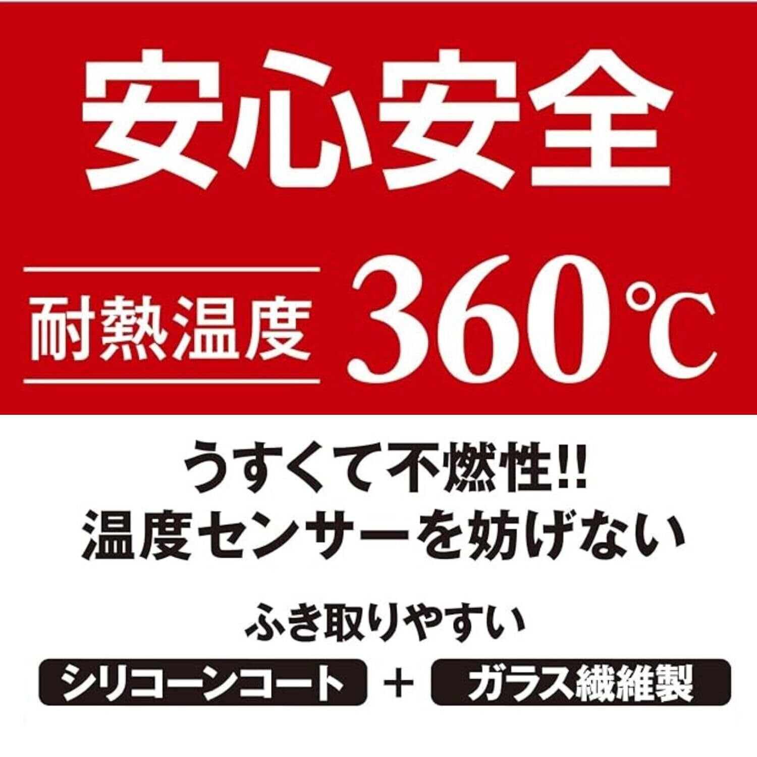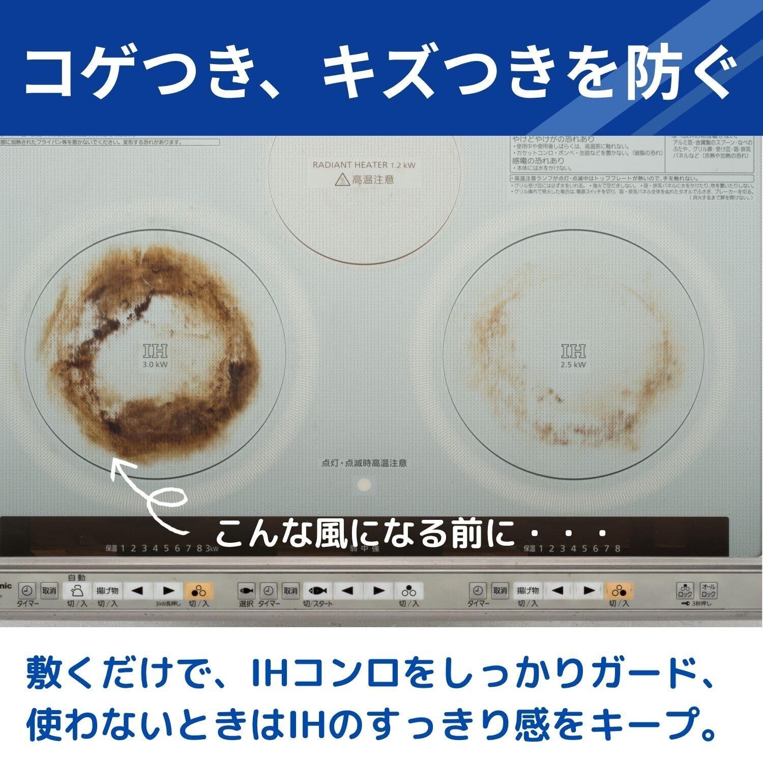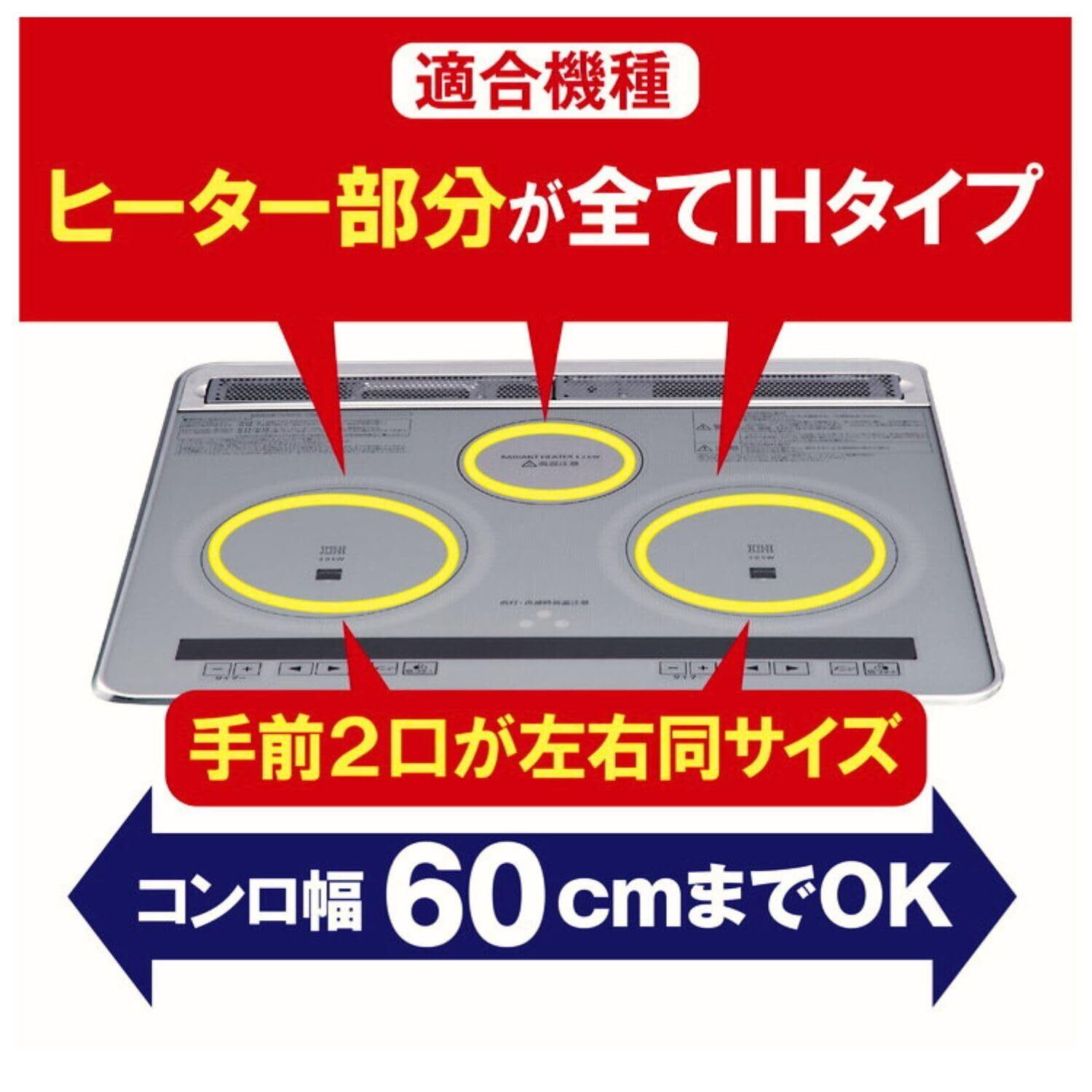 適合機種:3口IH用 (ヒーター部分が全てIHタイプ)。手前2口が左右同サイズ・コンロ幅60cmまで)。天板表面をワイドにカバー。ピタッとくっつきズレにくいので、快適にふき掃除がでる。不燃性素材。薄いガラス繊維製なので、加熱効率はほとんど変わらない。汁物等の液体は下に通さず、汚れもふき取りやすいので、お手入れ簡単