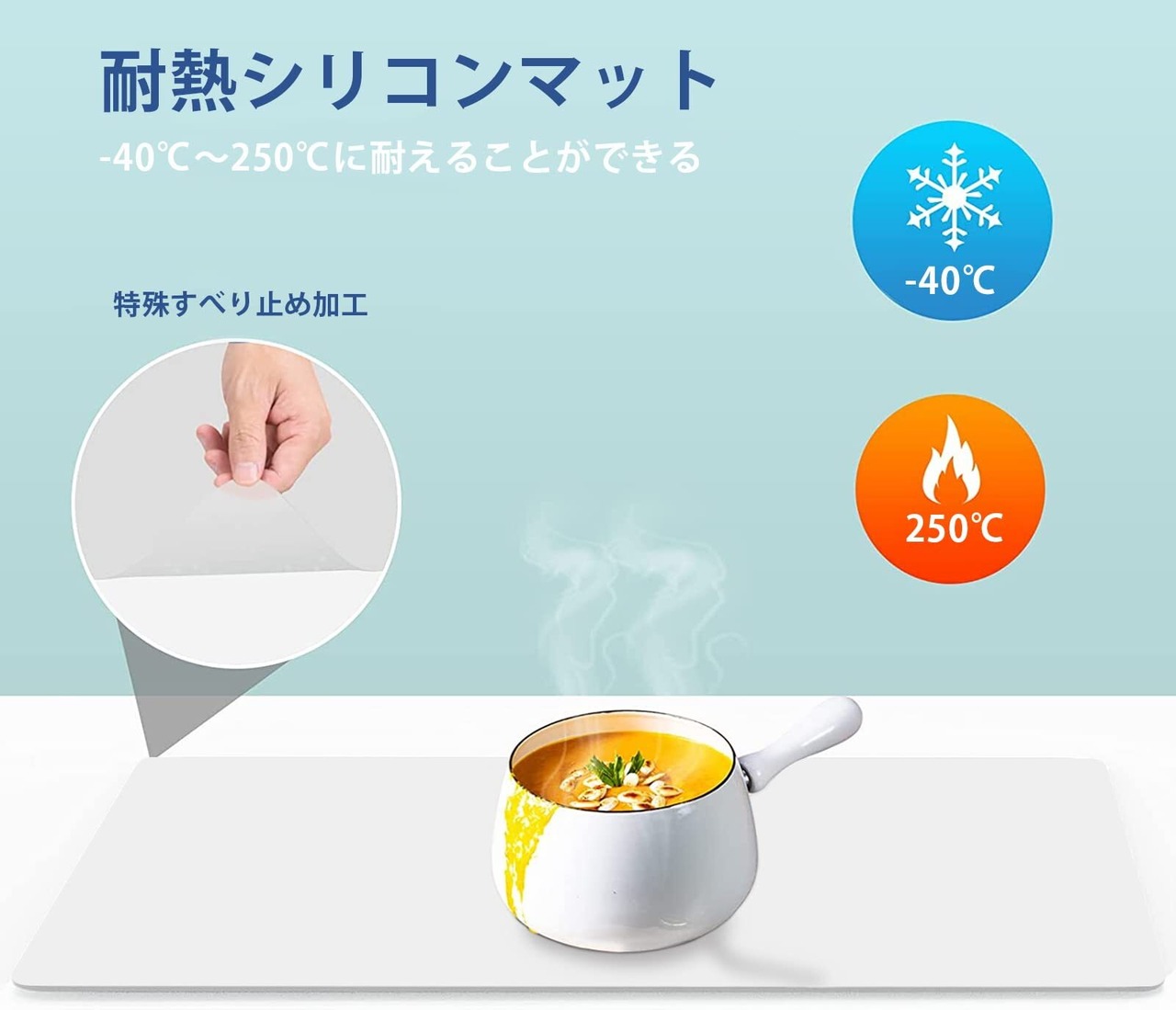 【シリコン素材、優れた耐熱性と耐久性】Aechy調理台シリコンマットは食品グレードのシリコーン素材を使用しており、環境に優しく、身体に影響のない安全なマットです。赤ちゃんランチョンマットにも適しています。耐熱性に優れ、-40°C~250°Cの温度に耐えることができます。テーブルマットや鍋敷きマットとしてもご利用できます。電子レンジ、フライパン、オーブンなどのキッチン器具の熱から台所を保護します。