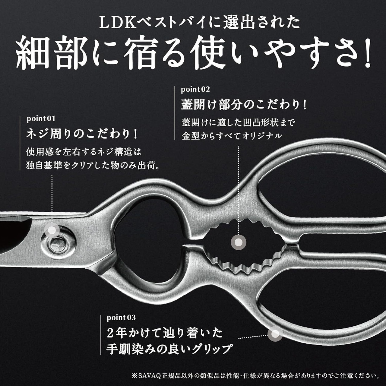 【プロ料理人との共同開発】 SAVAQは金型から作成したナイトライズ独自のオリジナルキッチンバサミです。 納得のいく質感に仕上がるまでステンレス一体成形の金型を何度も作り直し、開発に1年かけて完成しました。※デザインや形状を似せて販売している模倣品が急増しています。 品質が著しく劣っている可能性がございますのでご注意ください。