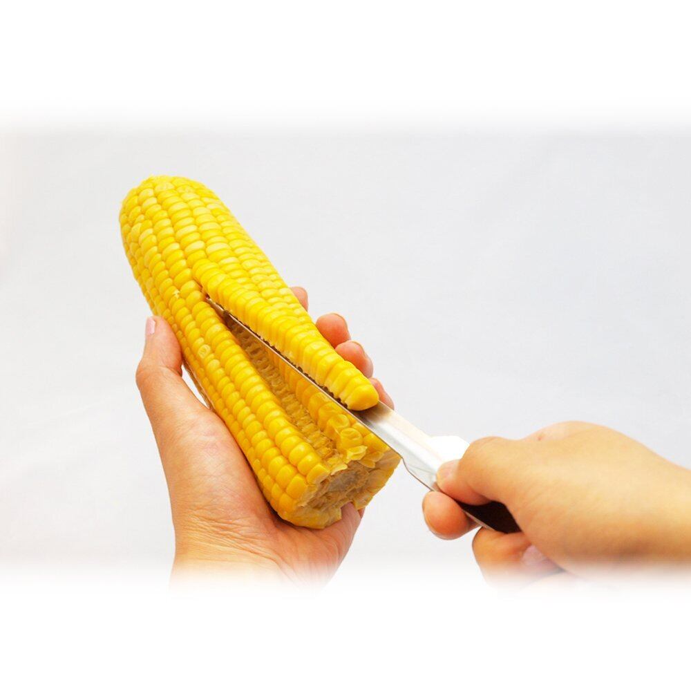 とうもろこしの粒が1列ずつきれいにとれます。刃先差し込みそのまま列に沿ってスライドさせることで、胚芽が残ったきれいな粒でとれます。1列取ったら順次隣の列にそって手でとっていくこともできます。指をあてる面が広くなっているので扱いやすくなっています。日本製。