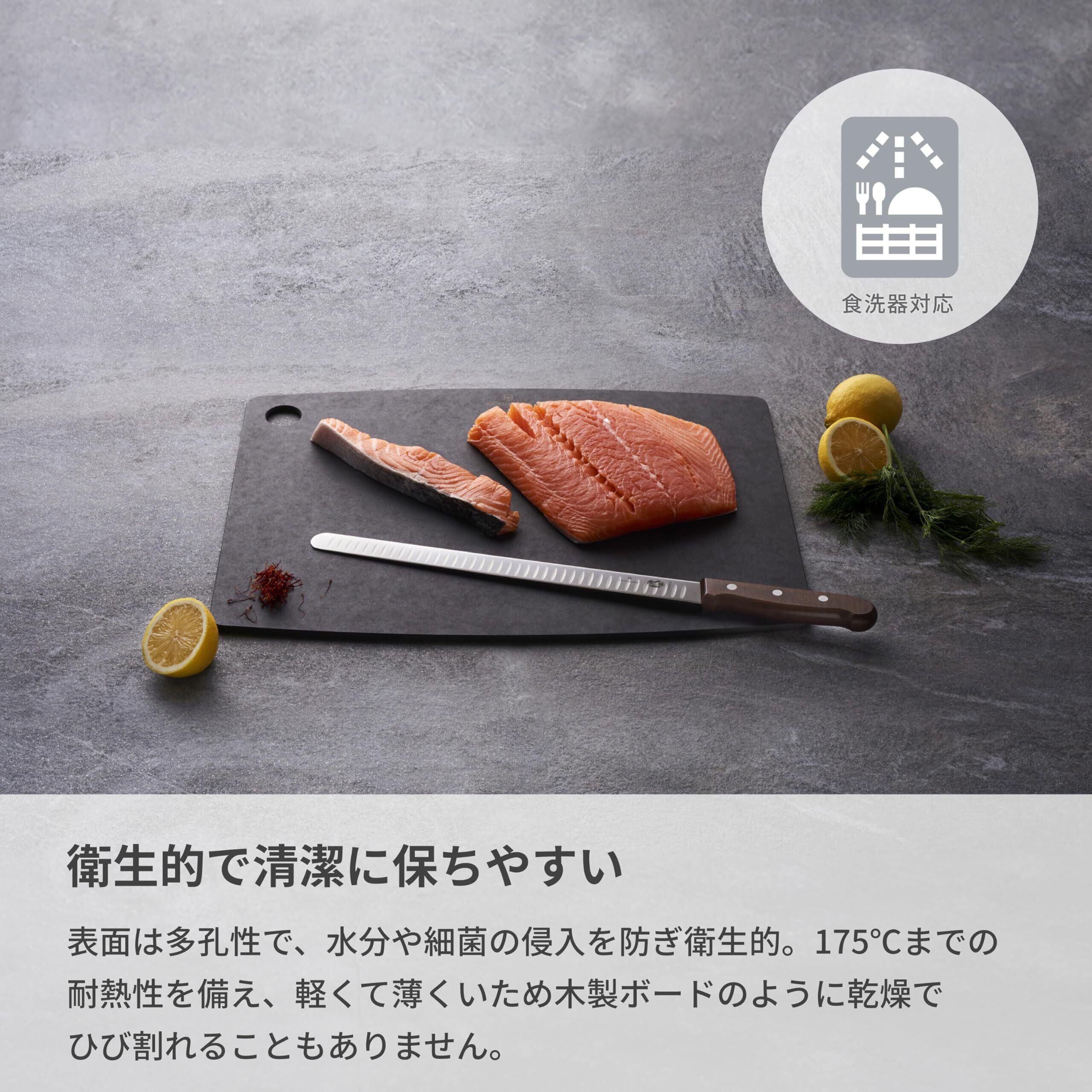 カッティングボードの素材、セルロース繊維加工品は、木工品のような暖かみと素晴らしい外観ながら、 軽くて薄く、食器洗い乾燥機に対応します。さらにプラスチックや通常の木製ボードと比較して非常に丈夫で、深い切り傷を最小限に抑えることができ、また木製ボードのように乾燥でひび割れることもありません。ビクトリノックスのカッティングボードは、非常に衛生的で、清潔に保ちやすく、プラスティックボードのようにマイクロプラスチックが食べ物に混入するリスクも回避できます。この素材は食品に使っても安全な樹脂を上質なクラフト紙に浸し、紙の向きを交互に変えながら重ね均等な熱と圧力でプレスすることで、紙の層を結合させ、しっかりとした安定したシート状の素材に仕上げています。