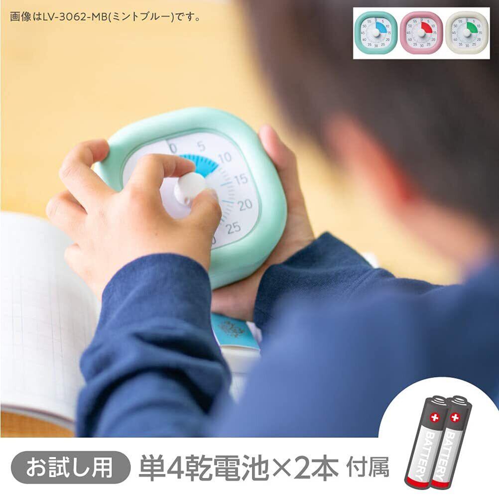 0時間の経過とともにフィルムが回転、色面が減っていくので、時間の経過を視覚的に実感できます。 時計が読めない、時間感覚がまだ身についていないこどもにもおすすめ。 カウントダウン終了を「ピピピッ」の電子音でお知らせします。カウントダウン中はカチカチ音が気にならない静音作動設計。 ダイヤルを回してセットするだけ! こどもでもカンタン操作 持ち運び、収納しやすいサイズのコンパクトタイプ。見やすい角度で自立します。