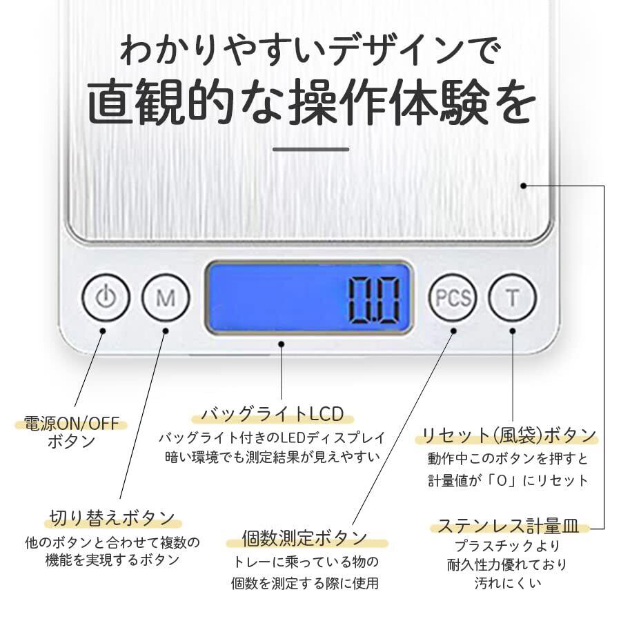 ①【0.1g単位の高精度計量】 0.1g から 3000g まで細かく計量できる高精度デジタルスケール。料理、製菓、コーヒードリップ、粉末計量など、繊細なレシピに最適です。