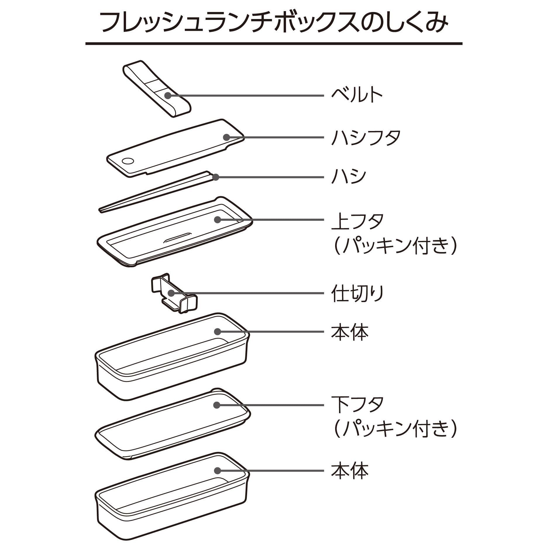 素材:上フタ・下フタ・本体・仕切り:ポリプロピレン / ハシフタ:ABS樹脂 / パッキン:シリコーンゴム / ハシ:飽和ポリエステル樹脂