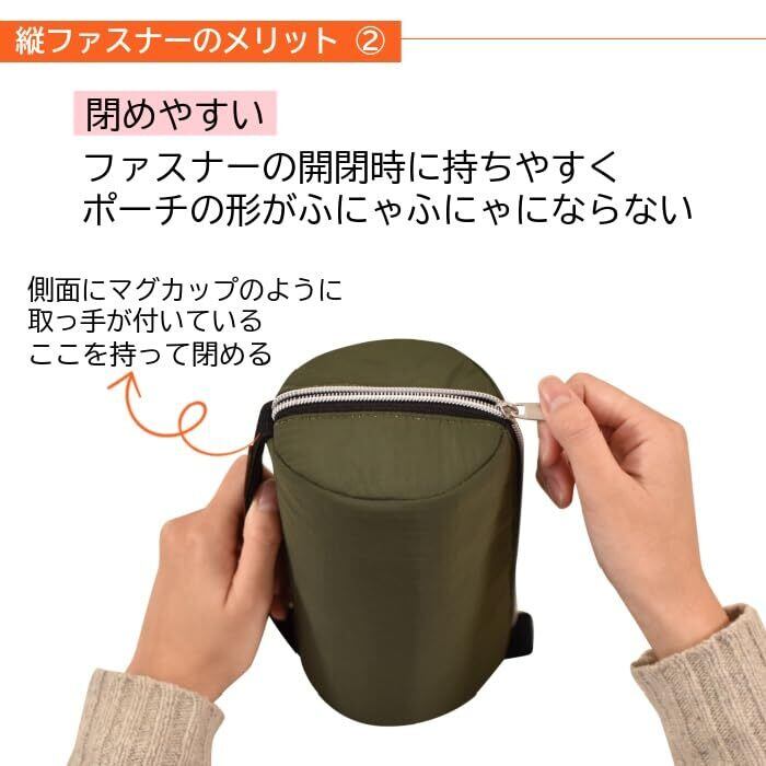 【縦ファスナーで出し入れしやすい】革新的な縦ファスナーを使用し、いままでの主流の横ファスナーのスープジャーポーチに比べ (1)開口が大きく出し入れしやすい、(2)ポーチ本体が自立しふにゃふにゃしない、(3)取っ手が付いて開閉の動作が安定する、(4)構造から薄く畳むことができる、という利点があります。