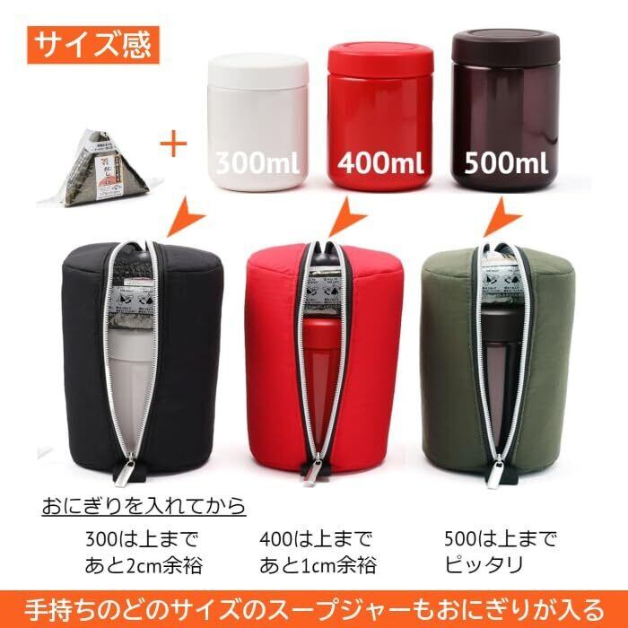 【おにぎりも入る】保温スープジャーポーチ。300ml,400ml,500mlのどの容量のスープジャーを使用しても上部におにぎりを入れるスペースがあります。スープの野菜とタンパク質、おにぎりの炭水化物、ポーチ一つでランチが完結します。おにぎり以外はパンやサラダ、小さめの丸いタッパーなど、上部のスペースを使って「+α」の使い方ができます。さらにランチタイムが楽しくなります。