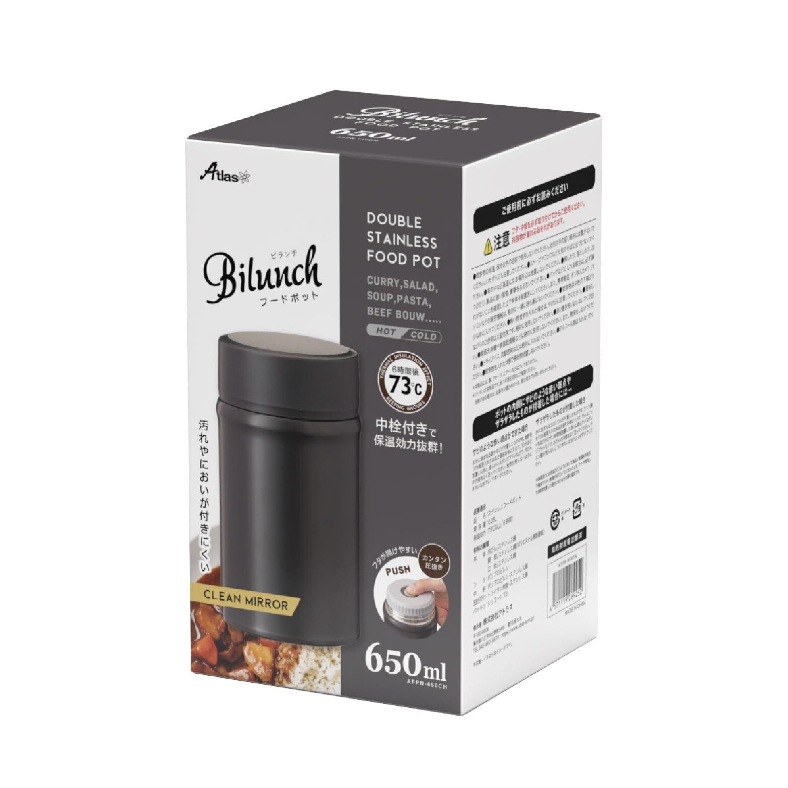 【2022最新】アトラス ビランチ 中栓付きフードポット スープジャー 650ml チャコール 真空断熱 保温 保冷 お弁当 AFPN-650CH