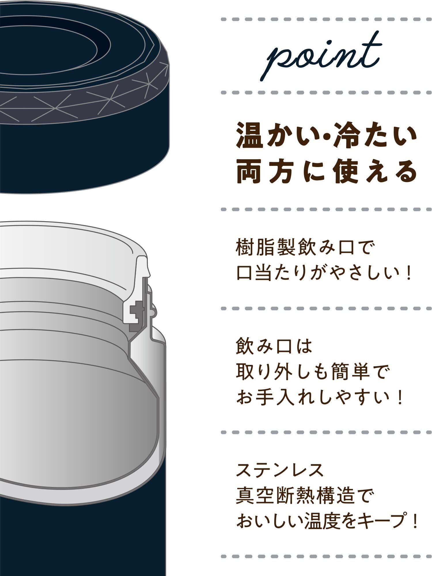 ●温かい・冷たい両方に使えるスープジャーです。●樹脂製飲み口で口当たりが優しいです。●飲み口は取り外しが簡単でお手入れしやすいです。●ステンレス真空断熱構造でおいしい温度をキープします。●お弁当と一緒にスープをもう一品!●スープの他に麺類、冷たいデザートなどにも。