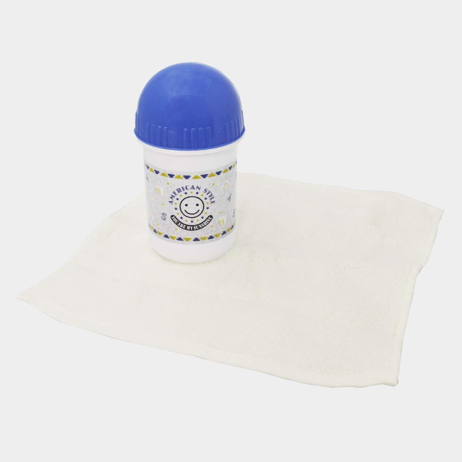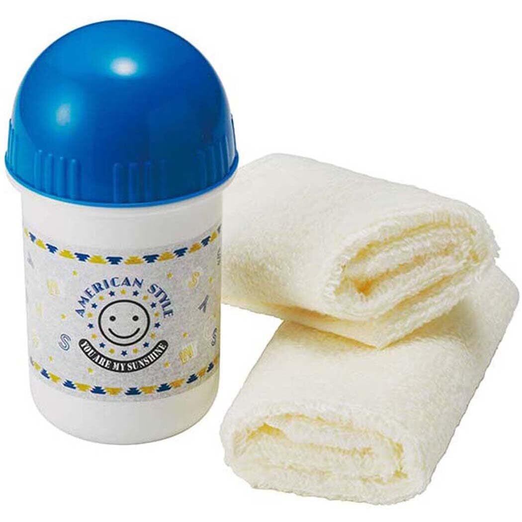 サイズ: ケース:約114×61×68mm、おしぼり:約200×200mm、材質: ケース・フタ=ポリプロピレン(抗菌加工)、おしぼり=綿100%、入数: ケース=1個入、おしぼり=2枚入、生産国:ケース=日本、おしぼり=ベトナム
