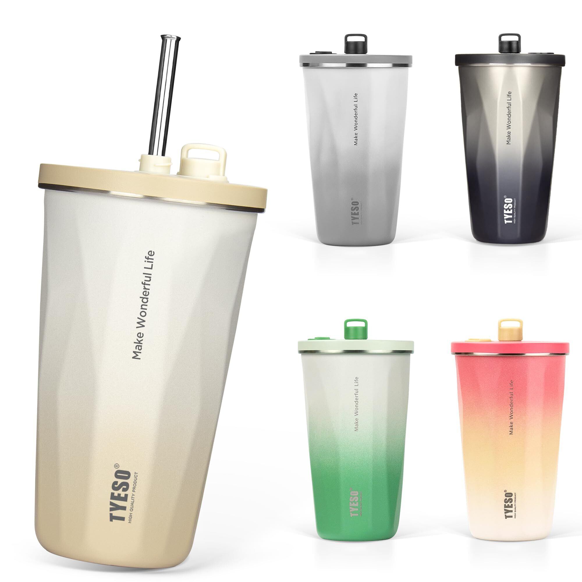 【新着商品】TYESO タンブラー ストロー付き ステンレス 広口 真空断熱 ホームオフィス アウトドア 多色 保温 保冷 ふた付き 600ml 大容量 女の子 男の子