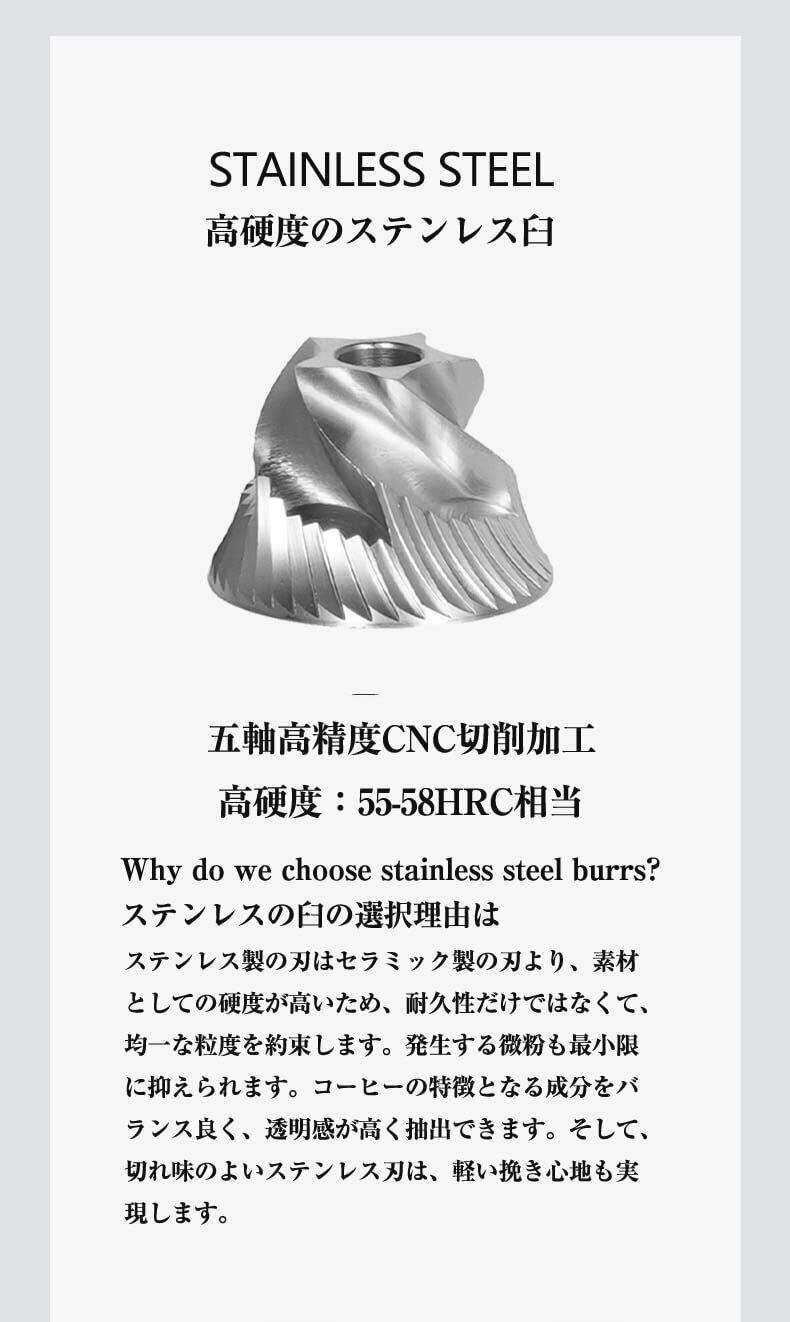 4.【優れた刃】:五軸CNC加工での55-58HRC硬さの臼刃は粗すぎる粒がほとんどない均一な挽目を実現。同時に微粉の発生も最小限に抑えます。