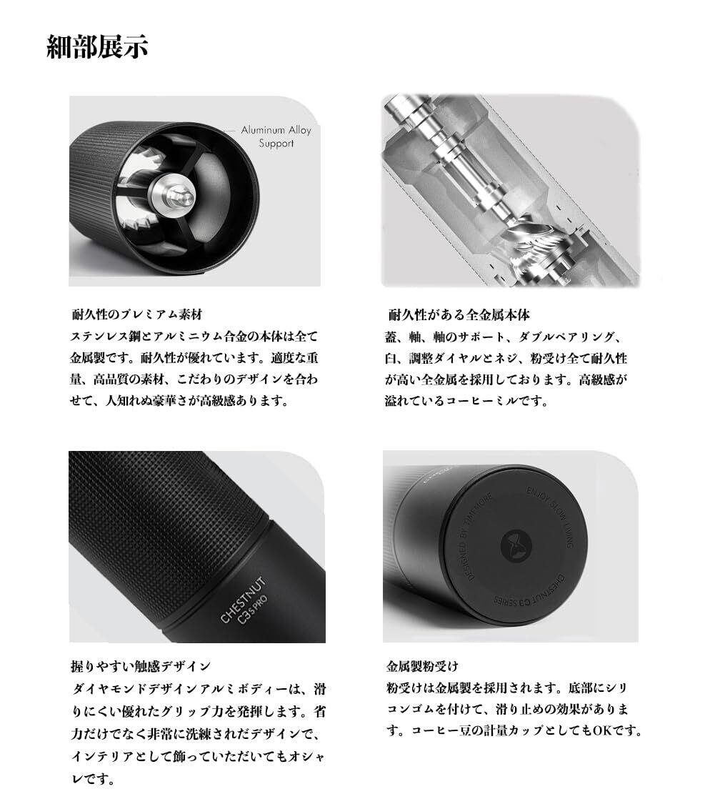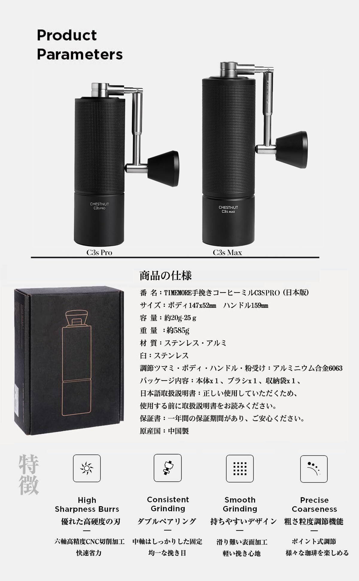 1.ブランド:TIMEMORE 型番:栗子C3sPro手挽きコーヒーミル 材 質 :ステンレス・アルミ(全金属) 刃:ステンレス サイズ:本体147x52mm 容 量 :約25g 重 量 :約585g