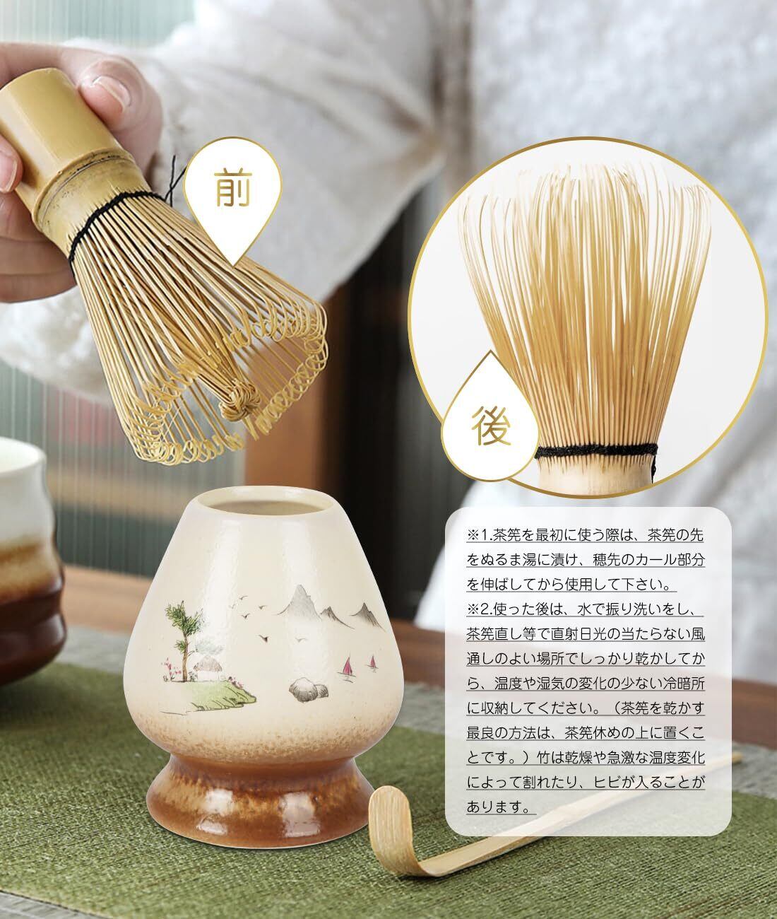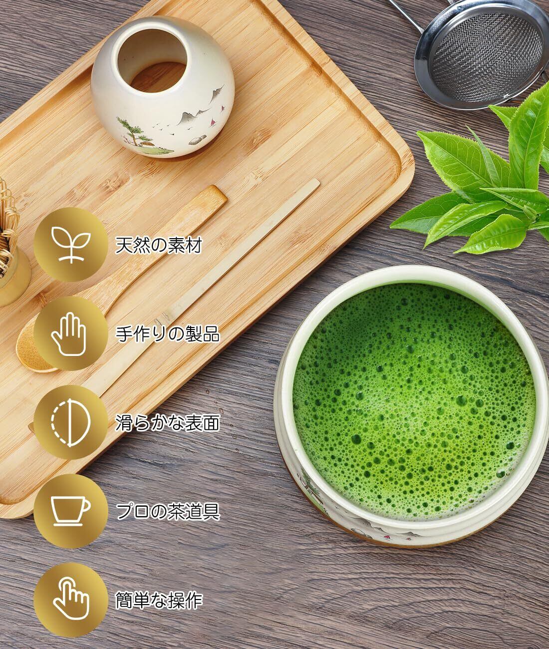 【シンプルな素材】この抹茶ツールセットは抹茶初心者やアマチュアに最適な、抹茶作りに欠かせないツールがほぼすべて揃っています。高品質のセラミックと竹の素材で作られています。すべての素材は自然で毒性がなく、安全で信頼性の高い方法で使用できます。エッジ処理は繊細で滑らかに磨かれ、形はシンプルです。