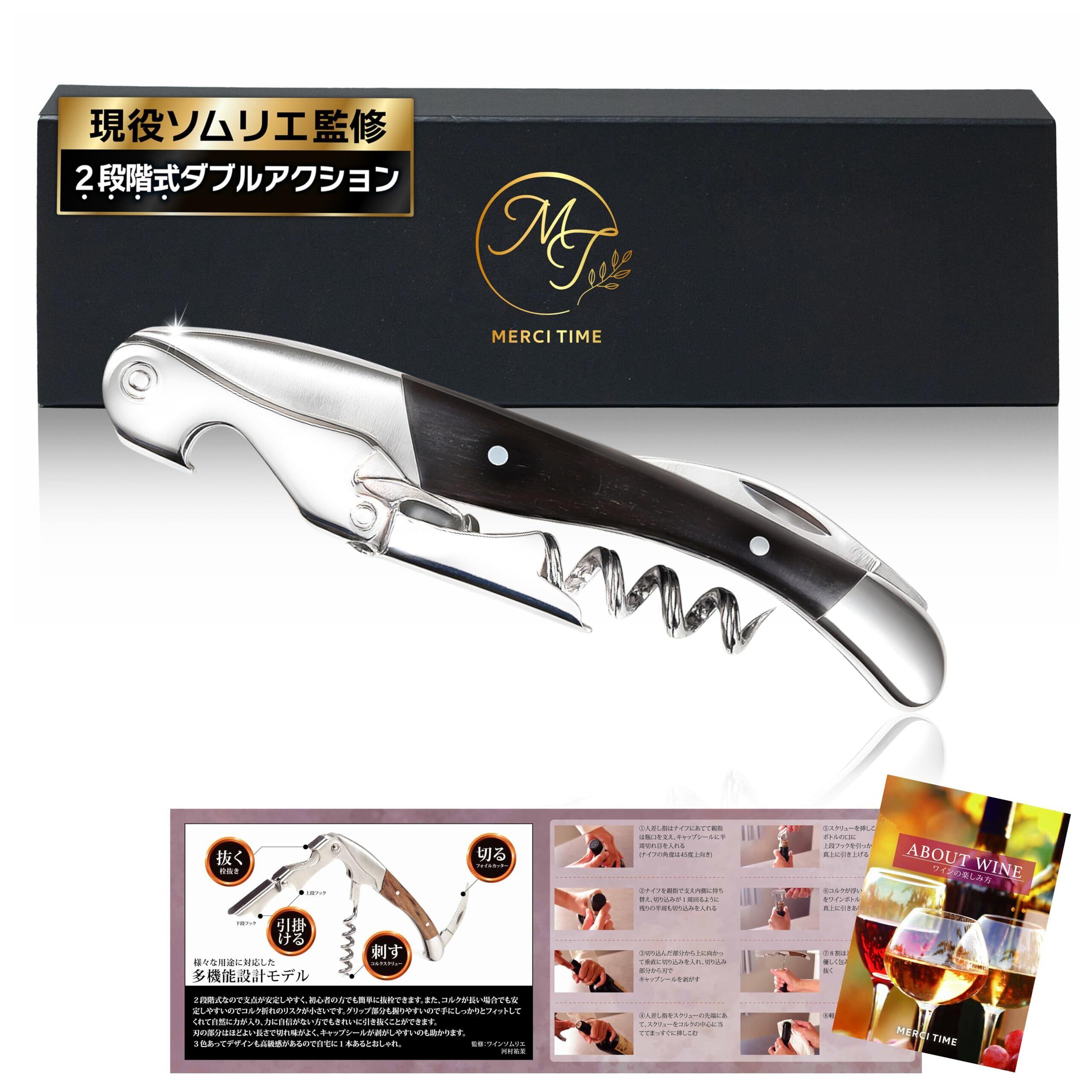 MERCITIME ソムリエナイフ ワインオープナー 栓抜き 2段階式 コルク抜き 簡単 ダブルアクション プレゼントにも 天然木ハンドル (エボニー)