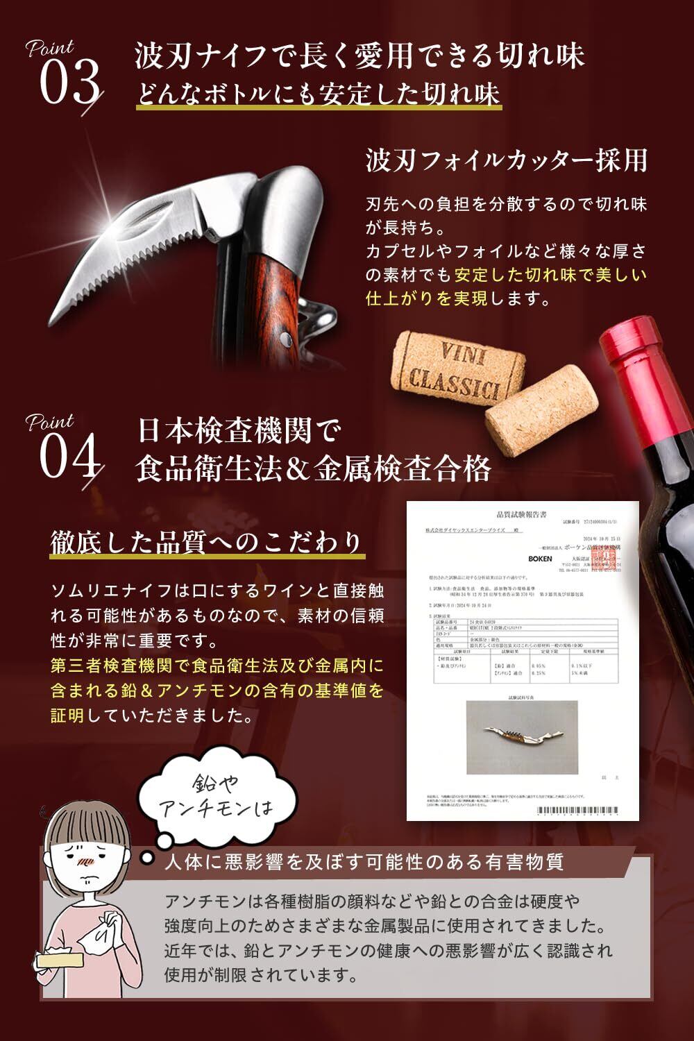 【現役ソムリエ監修の確かな品質とプロ仕様】ワインのプロである現役ソムリエが監修し、細部まで使いやすさにこだわった設計を実現しました。さらに、品質にもこだわり日本の検査機関にて厳正な品質検査を実施し、末永くご愛用いただけま