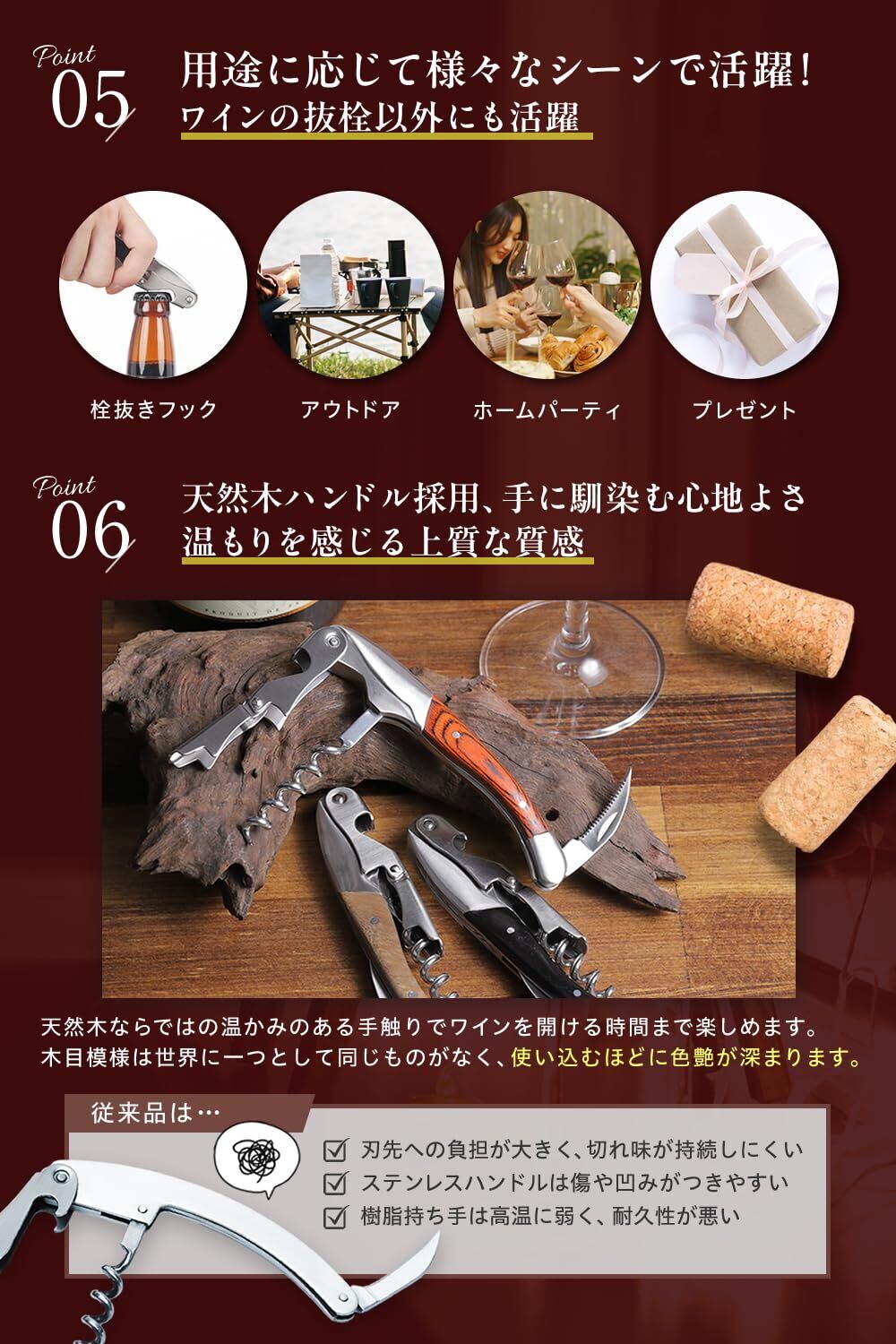 【天然木ハンドルが生み出す上質な使い心地と高級感】 温かみのある天然木を採用したハンドルは、手に馴染みやすく、ワインを開ける喜びを高めます。世界に一つとして同じものがない木目模様は、使い込むほどに味わいを深め、愛着の湧く逸品として末永くお使いいただけます。