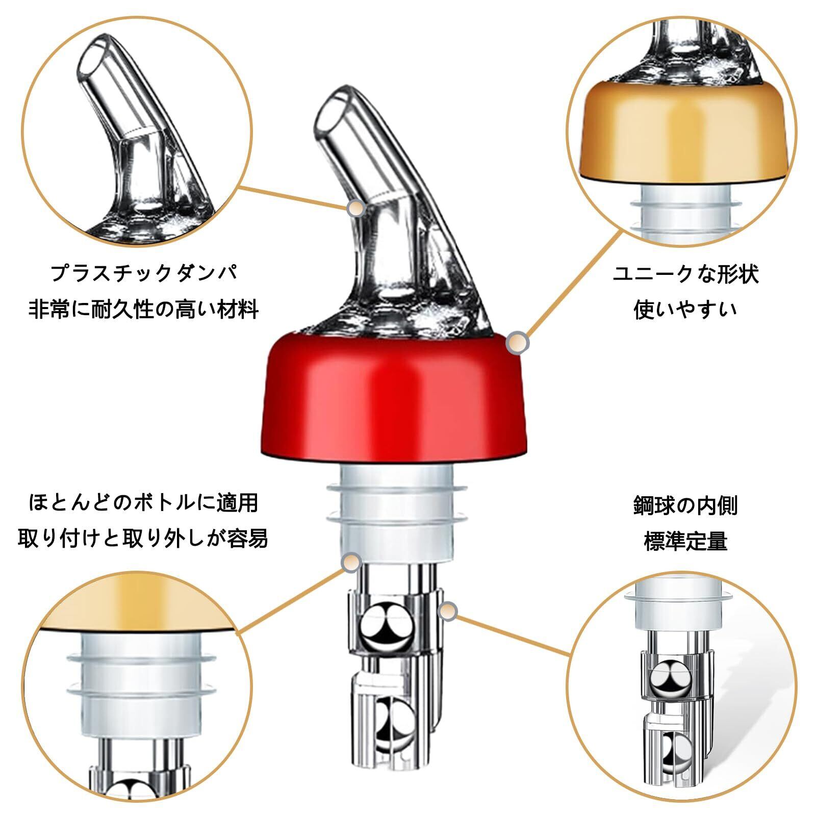 【セット内容】金色の注ぎ口(45ml)×3個。製品高さ9.5cm。ボトルの口径が2〜2.2cmのワインボトルや他のボトルに適用。取り外しと交換が容易で、石鹸水で手洗いして再利用できます。簡単で便利。