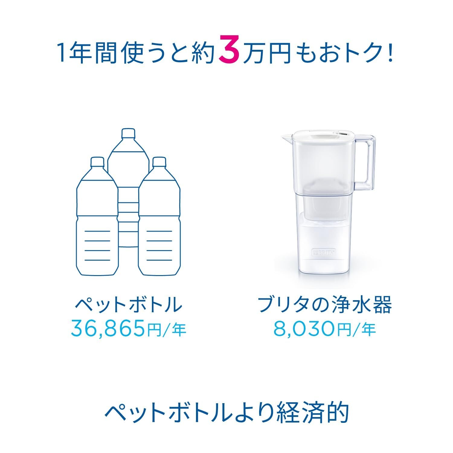 ブリタの浄水器を1年間使用すると約3万円おトク *1日あたりペットボトルを1本(2L)、1年間で365本(730L)の水を利用した場合。 【ブリタのカートリッジ】カートリッジの1Lあたりのコスト:11円×730L=8,030円 【ペットボトル】2Lペットボトルの価格:101円×365日=36,865円 小売物価統計調査(動向編)より(東京都区部小売価格、2022年1月〜2022年12月平均価格) ・上記はすべて税抜価格を前提に算出しました (2024年3月時点)