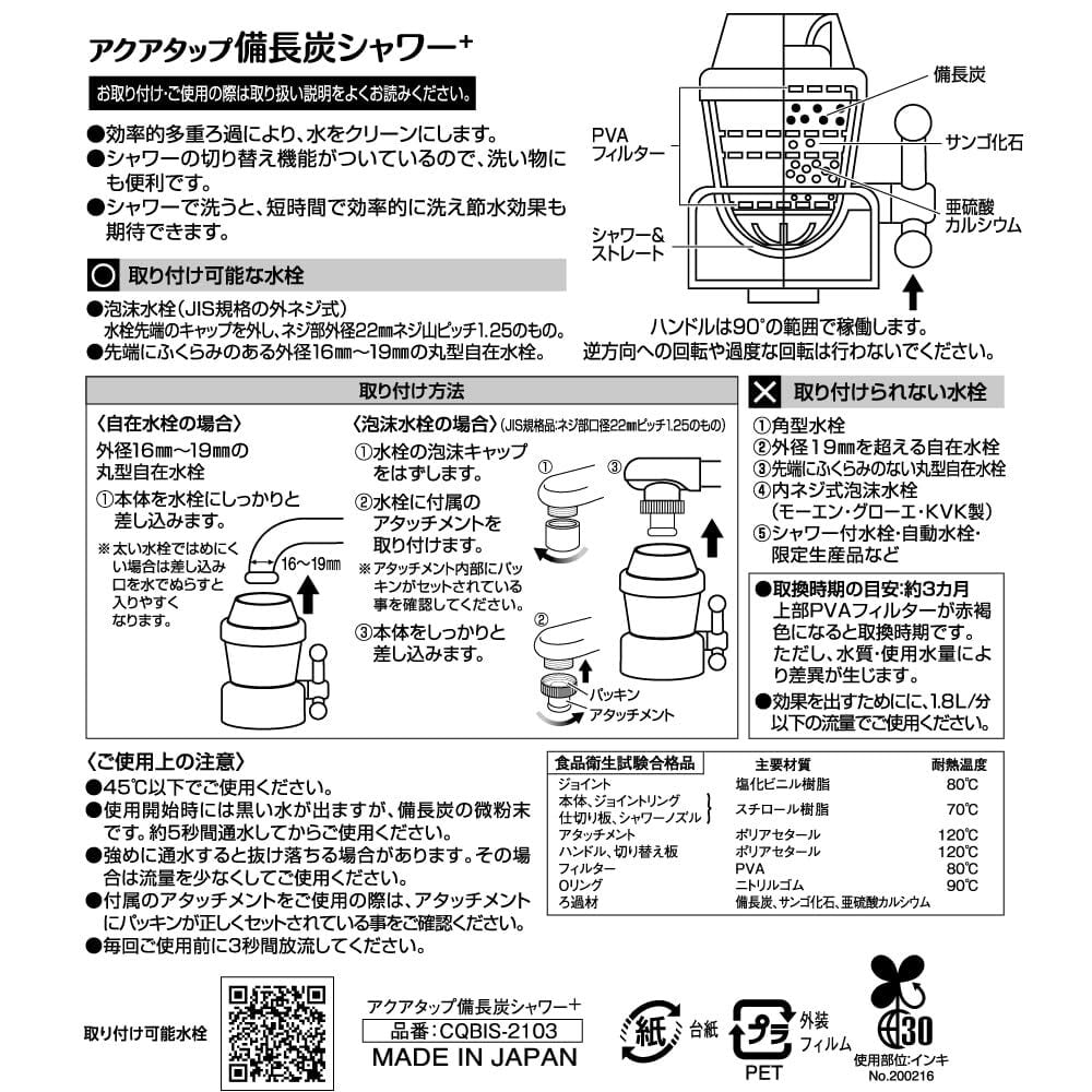 【特価セール】クリタック(Kurita) アクアタップ備長炭シャワー+ 日本製 CQBIS-2103