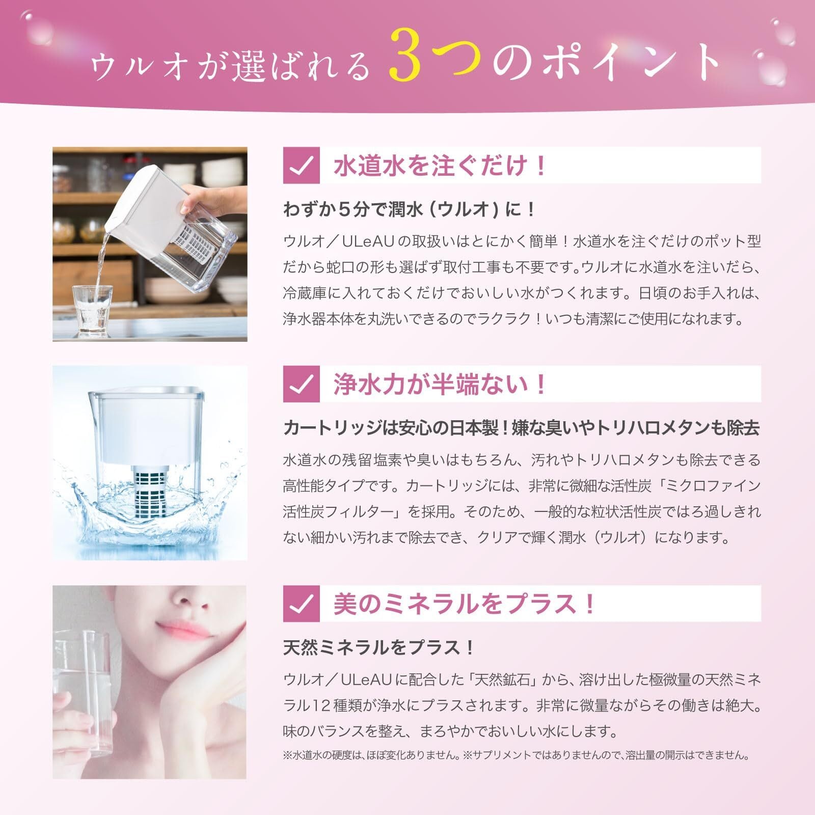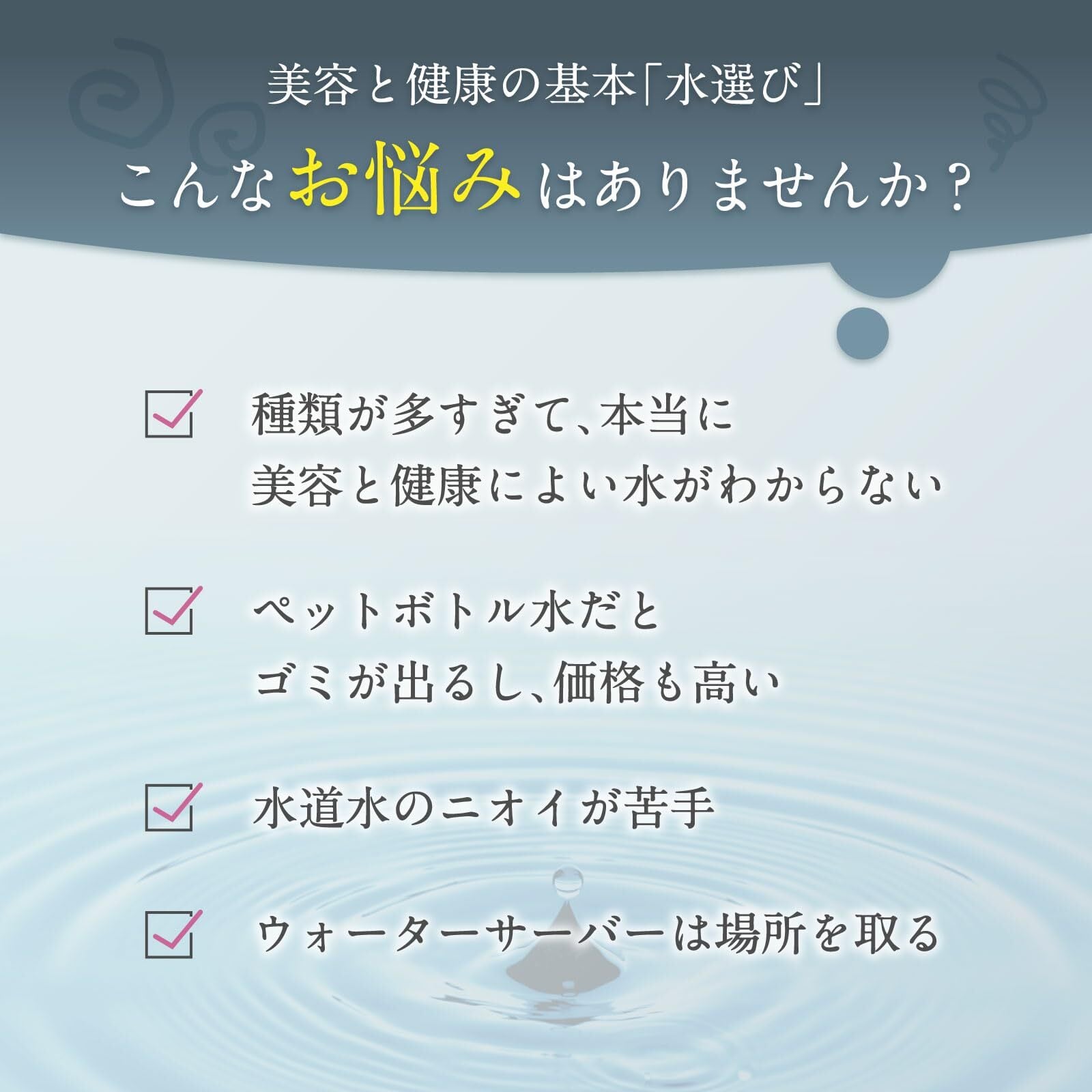 ポット型浄水器で第1位の浄水能力!ミクロファイン活性炭フィルターで驚くほどの美味しいお水に。塩素、トリハロメタンなど23項目を除去しつつ、天然鉱石によってミネラルをプラス。内側からキレイを手に入れる事ができます。