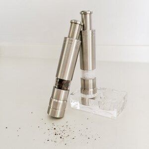 ワンハンド/片手で使えるソルト&ペッパーミルセット。高級感漂うステンレス製。アクリルスタンド付き。