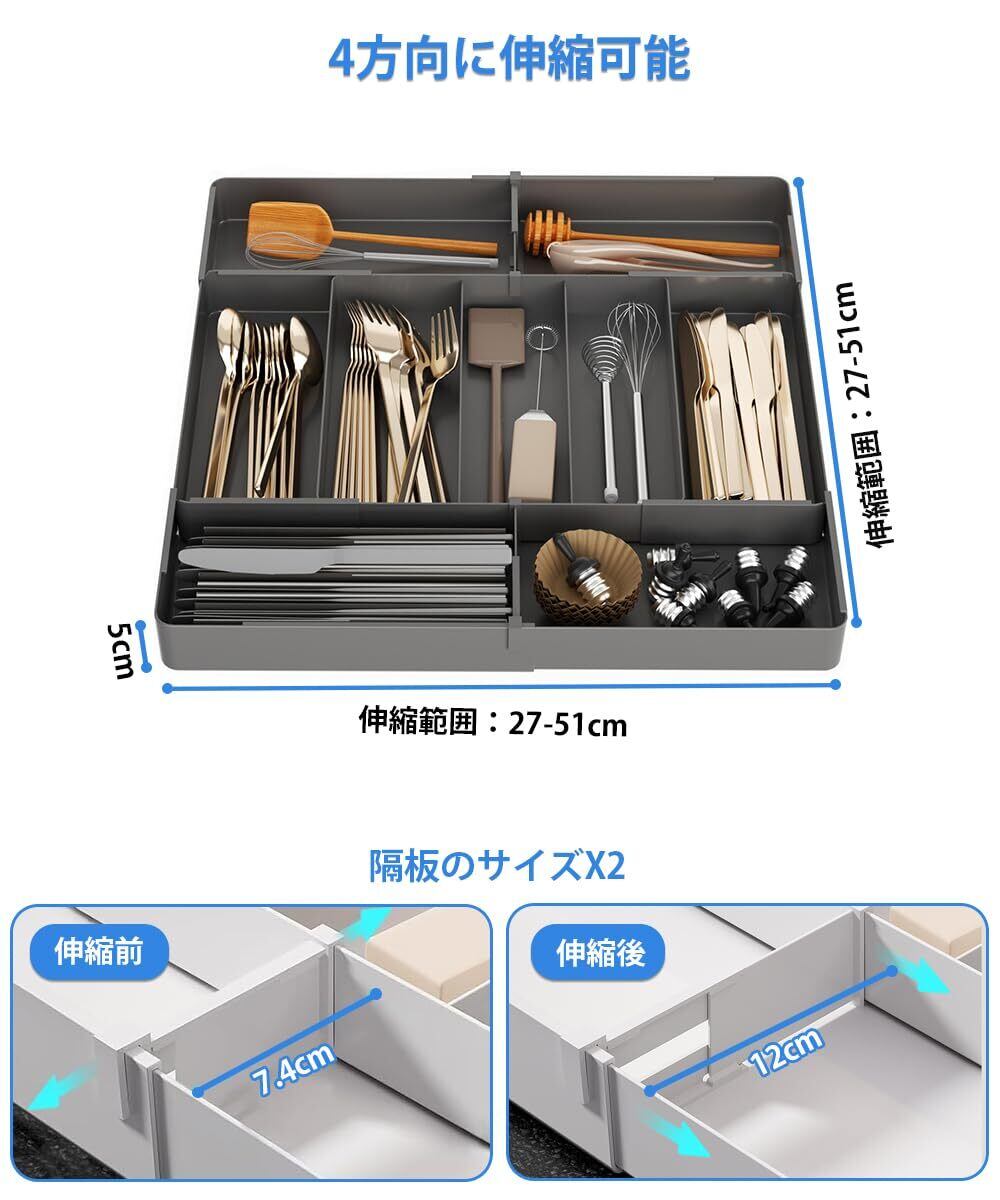 【4方向への伸縮カトラリーケース 】4方向にも自由に調整できるため、引き出しや収納スペースに完璧にフィットさせることができます。これにより、スペースを無駄にすることなく効率的に収納できます。