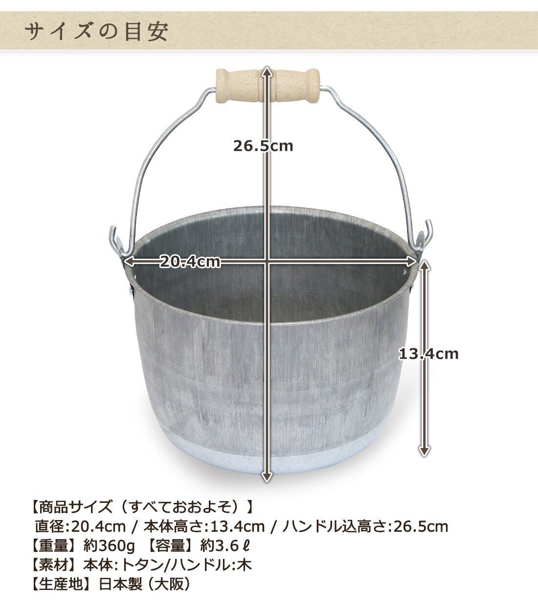 【商品サイズ(すべておおよそ)】 直径:20.4cm / 本体高さ:13.4cm / ハンドル込高さ:26.5cm