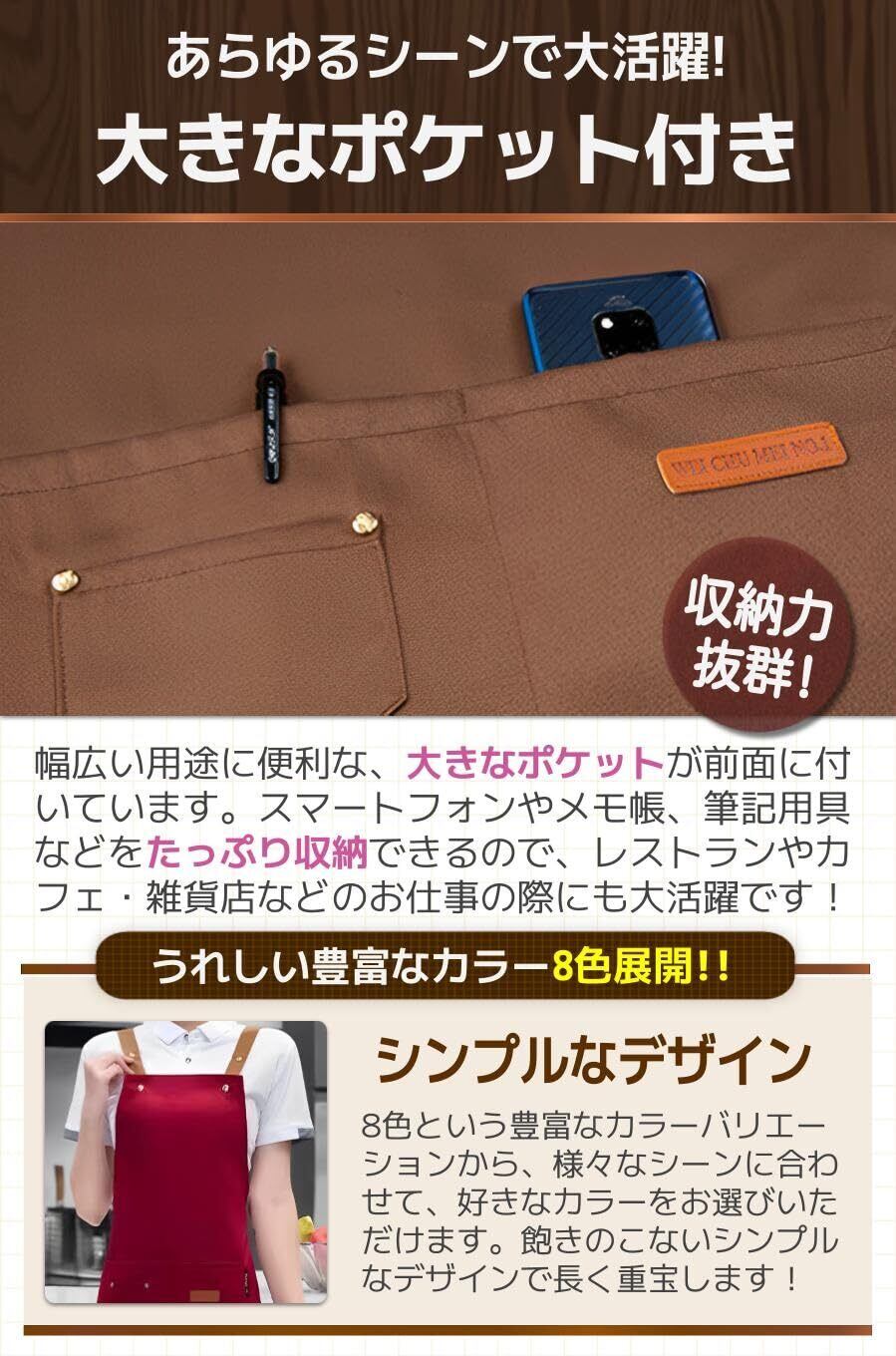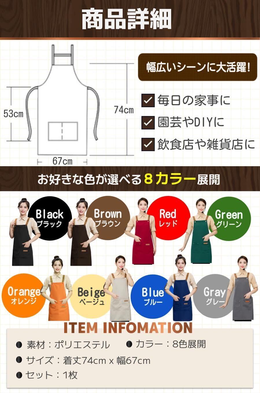 【商品特徴】①幅広いシーンで活躍:ご自宅の家事や飲食店などのお店でも!/②着脱簡単なH型仕様:肩から掛けるだけのH型で使いやすい!/③男女兼用で使用可能:サイズ調節が可能なので男女どちらでもOK!/④色落ちしにくい!:洗濯を繰り返しても色落ちしにくい!