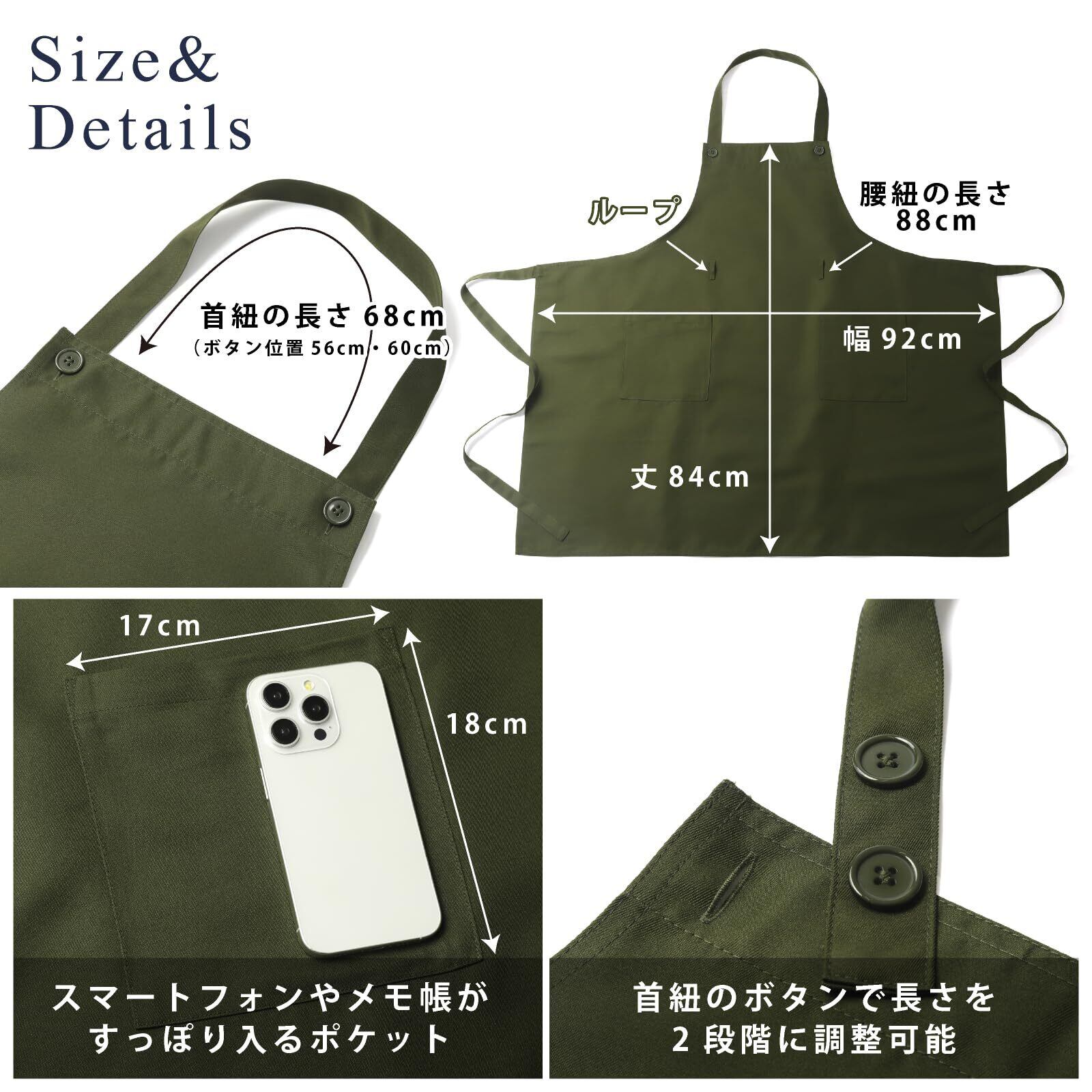 【 日常のお手入れ楽々 】:素材はしわになり難く・乾きやすい・縮み難い・色落ちし難い、こだわりのポリエステル。洗濯後のお手入れも大変簡単と大好評です。エプロン自体の重さは210gでしっかりとした質感があり、生地は透けることなく、強さがあり長くご使用頂けます。