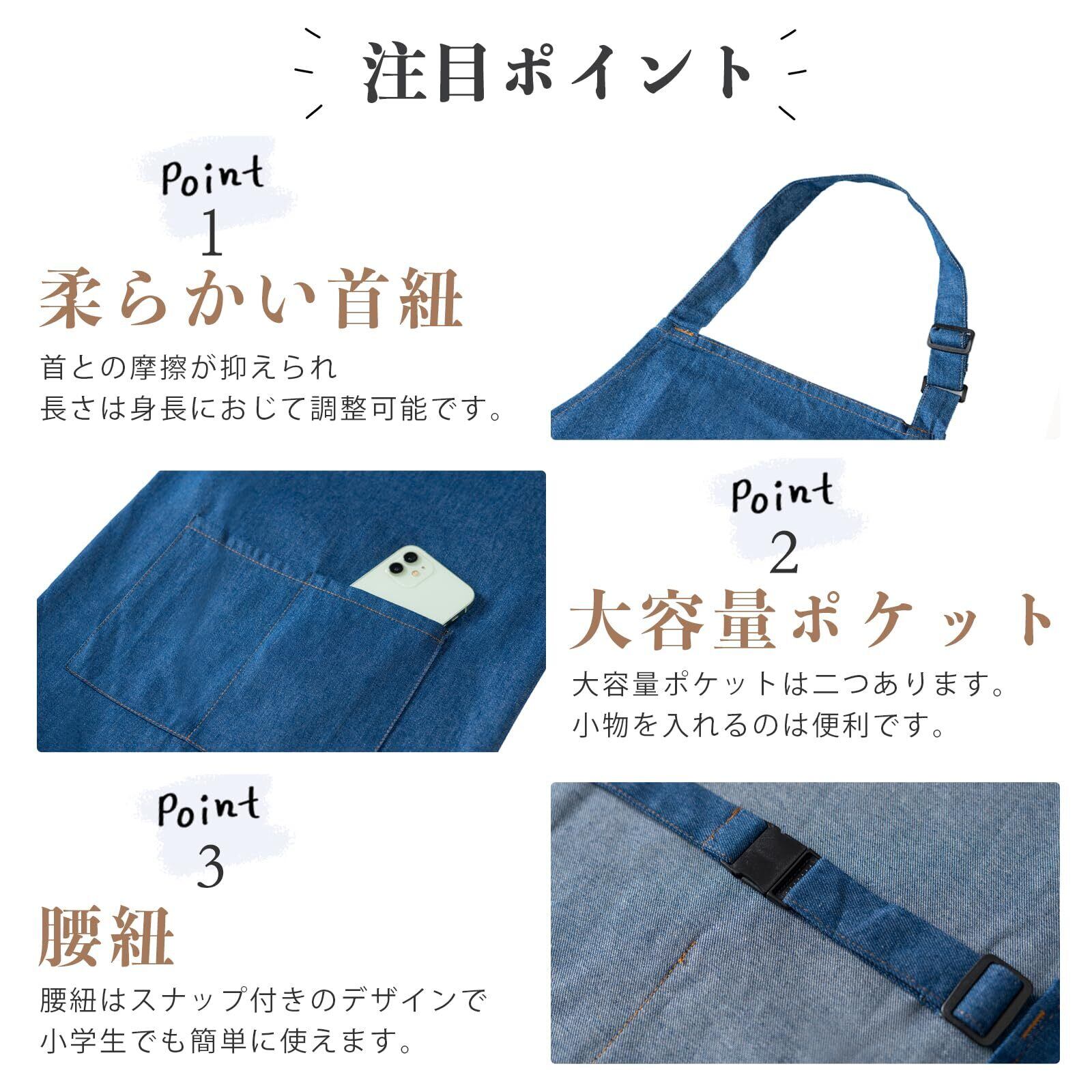 【デニム材質と3点セット】デニム材質(綿80%、ポリエステル20%)を使用し、長持ちします。セットにはエプロン、三角巾、収納袋が含まれています。