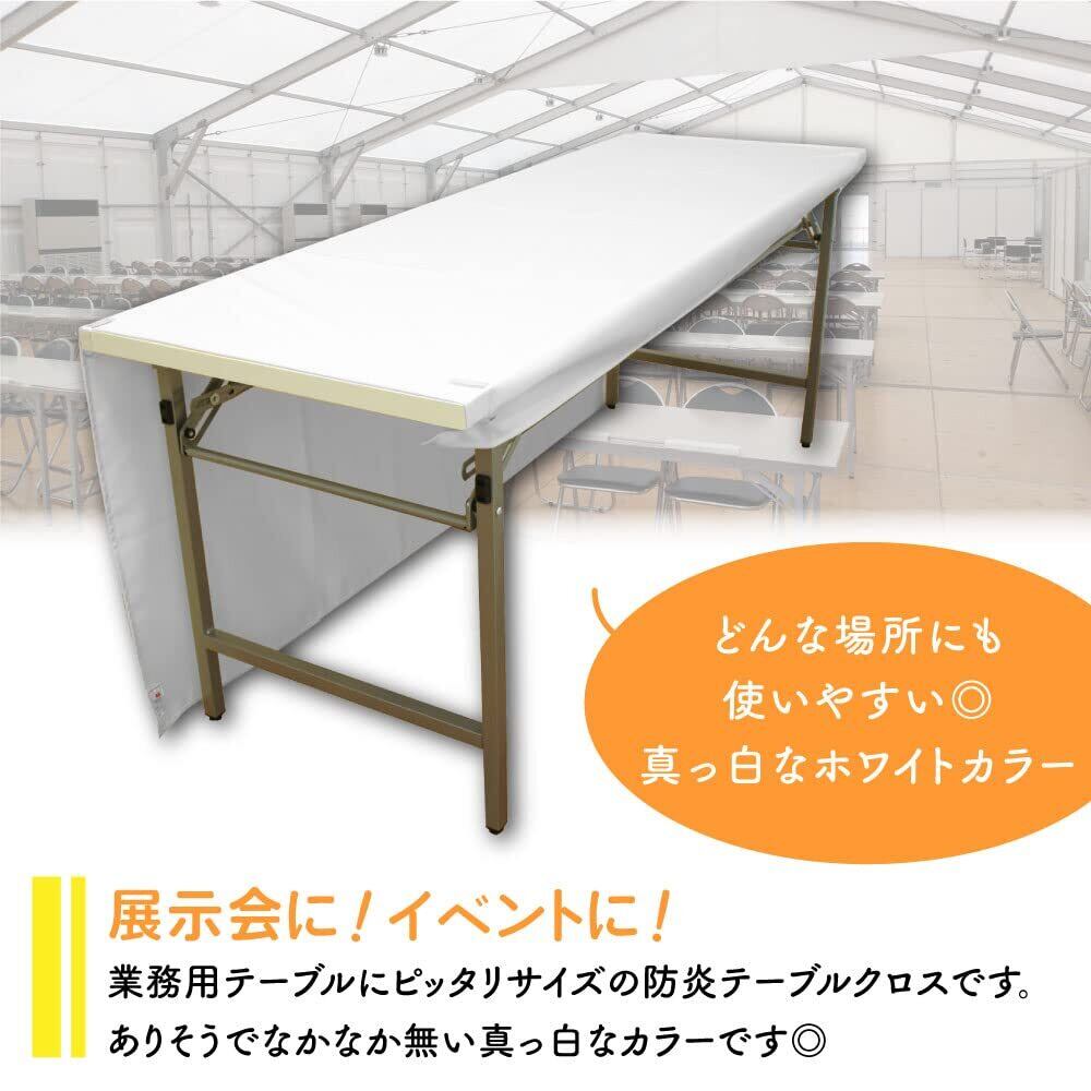【ポイント】防炎加工の施されたテーブルクロスです。なかなか無い真っ白なホワイトカラーです。業務用テーブルにピッタリのサイズなので展示会、説明会、各種イベント等でお使いいただけます。 また、家庭用としてもお使いいただけます。汚れた場合は洗濯も可能です。シンプルなホワイトカラーなので様々な用途、シーンに合わせてお選びいただけます。