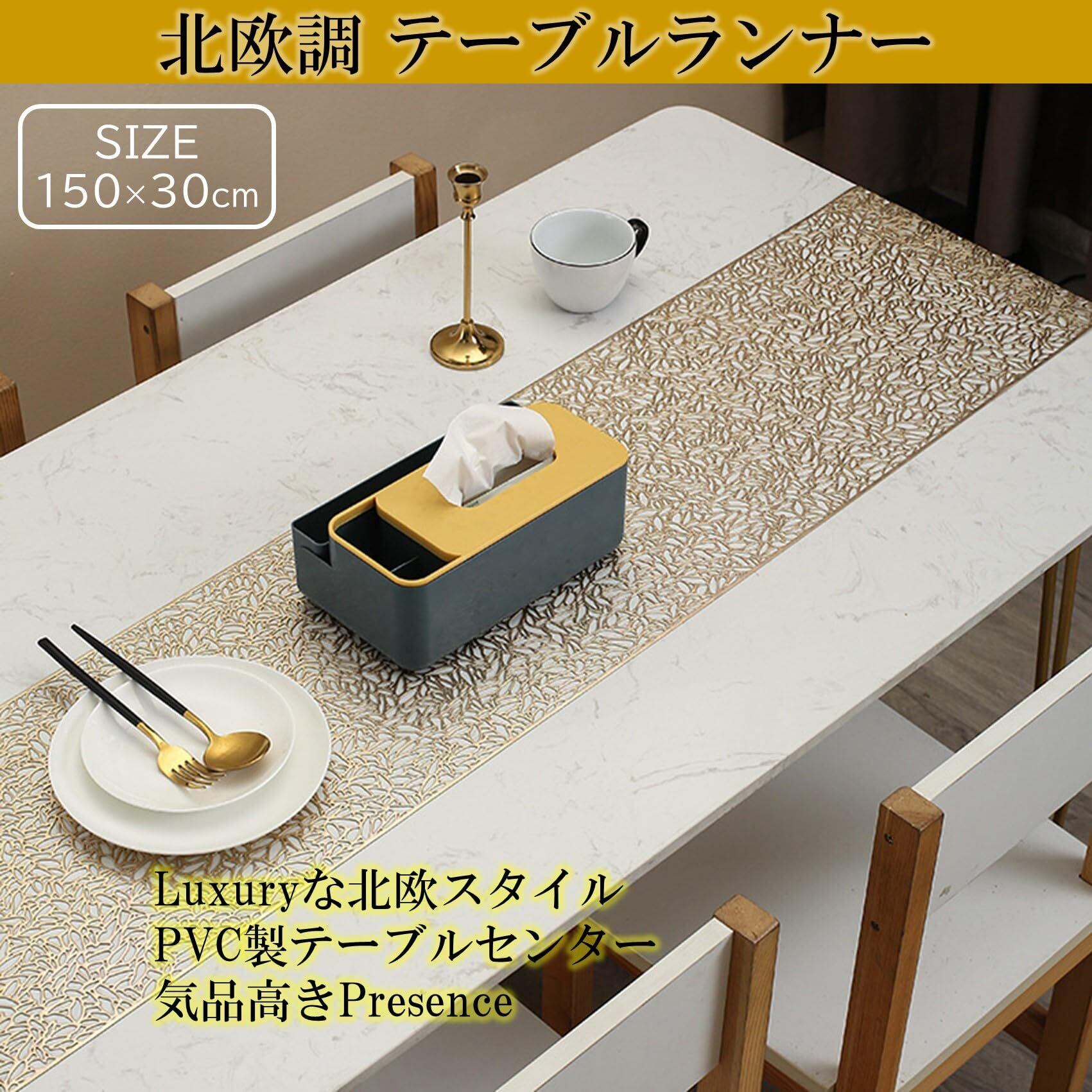ラグジュアリーな北欧調テーブルランナー。SIZE 150×30cm。PVC製で装飾品、カトラリーやグラス、食器類が滑りにくい防滑設計となっております。汚れや水分も拭き取るか水洗いをするだけで、布製の様に汚れが染み込む心配もございません。パーティー、披露宴などのセレブレーション、ご自宅のダイニングを華やかに彩る気品高きPresenceテーブルセンターです。