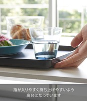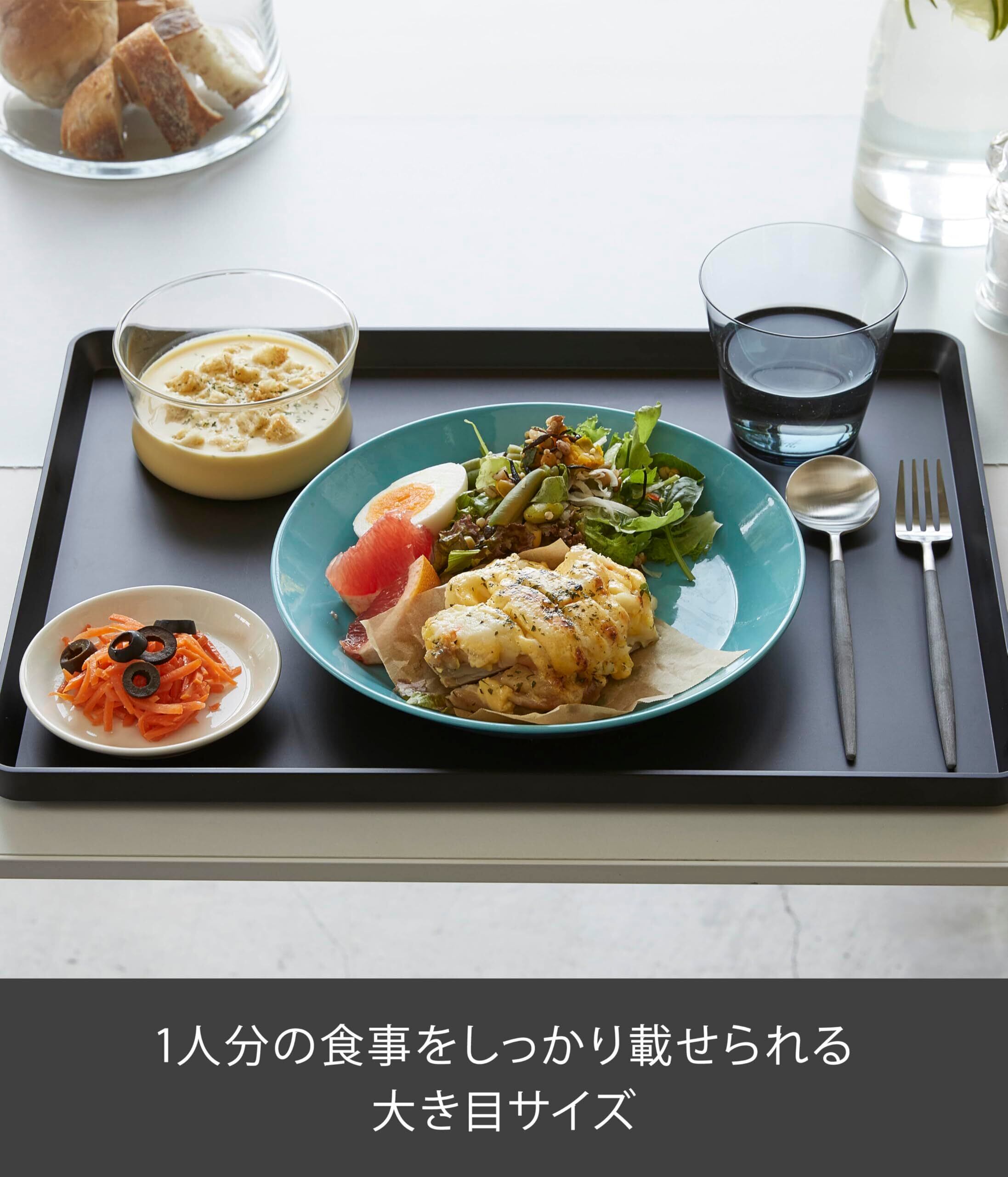 小皿から大皿までしっかり置けて持ち運べる大き目サイズのトレー。