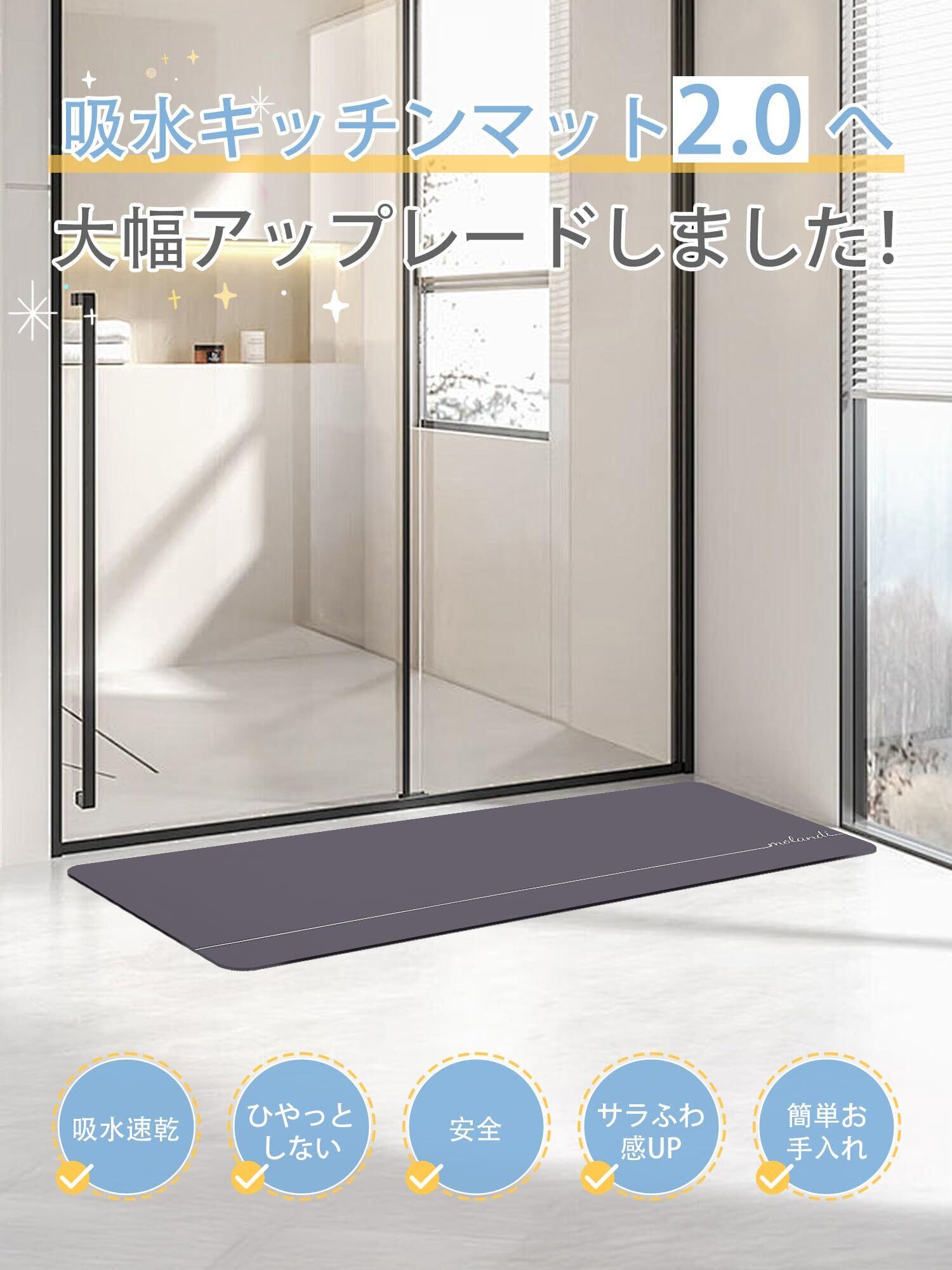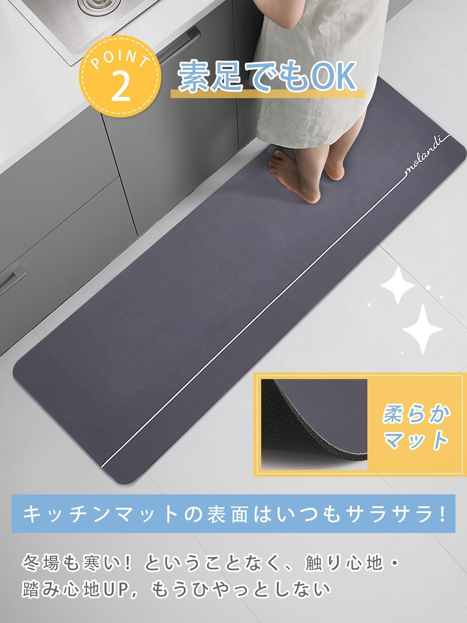 【吸水性・速乾性に優れている】特殊な吸水繊維を使用したキッチンマットは、細かい穴が多く開いており、水分を素早く吸収します。速乾性に優れた発泡層は水を早く放出し、キッチンマットの表面はいつもサラサラ!