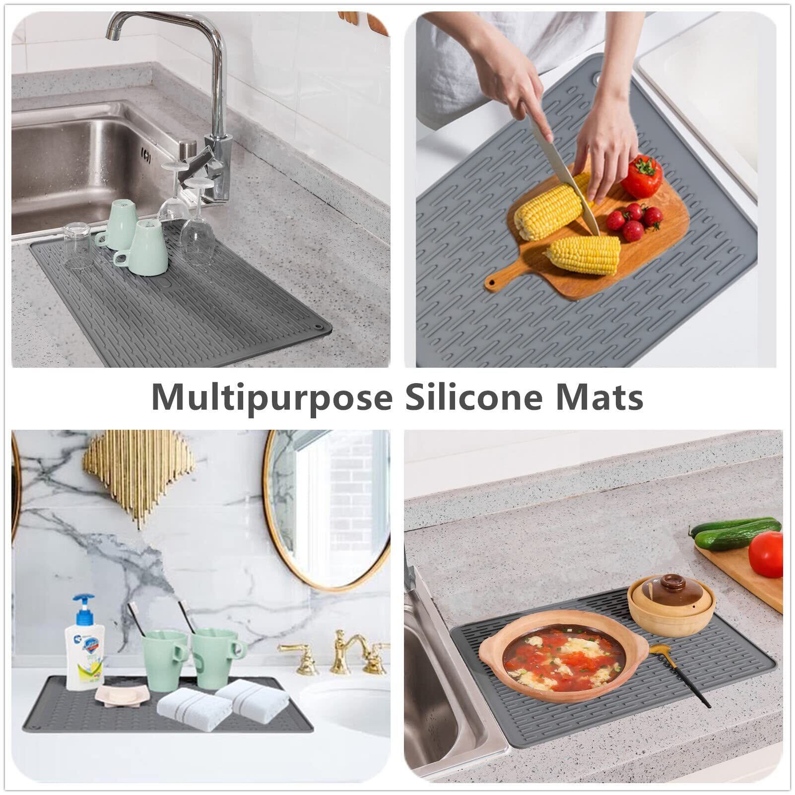 滑り止め&耐熱性:滑りにくいクッション性のある表面で、食器をしっかり固定。ガラス製品の転倒や騒音を軽減し、熱い鍋やフライパンからもカウンターを保護します(-40℃~230℃対応)。