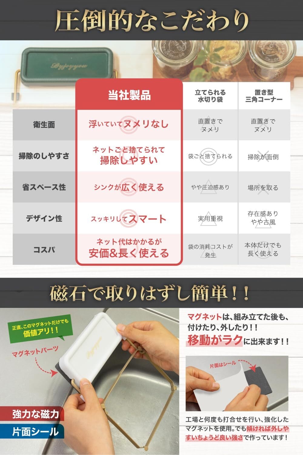 【数量限定】OZMAIN 三角コーナー はがせるテープとマグネットでどこでも簡単取付 いらず マグネット 水切り ネット ゴミ袋 ホルダー 生ゴミ シンク パールホワイト