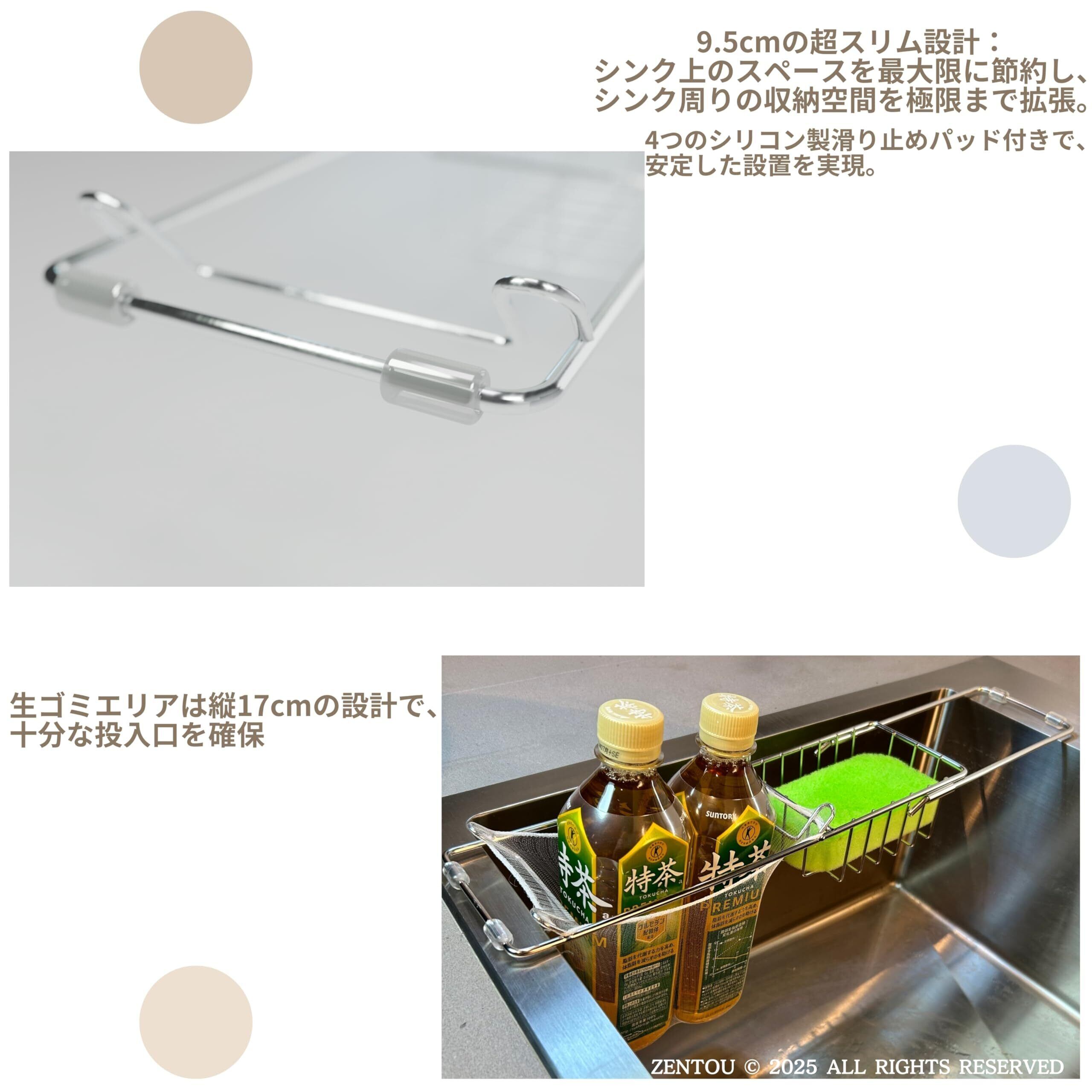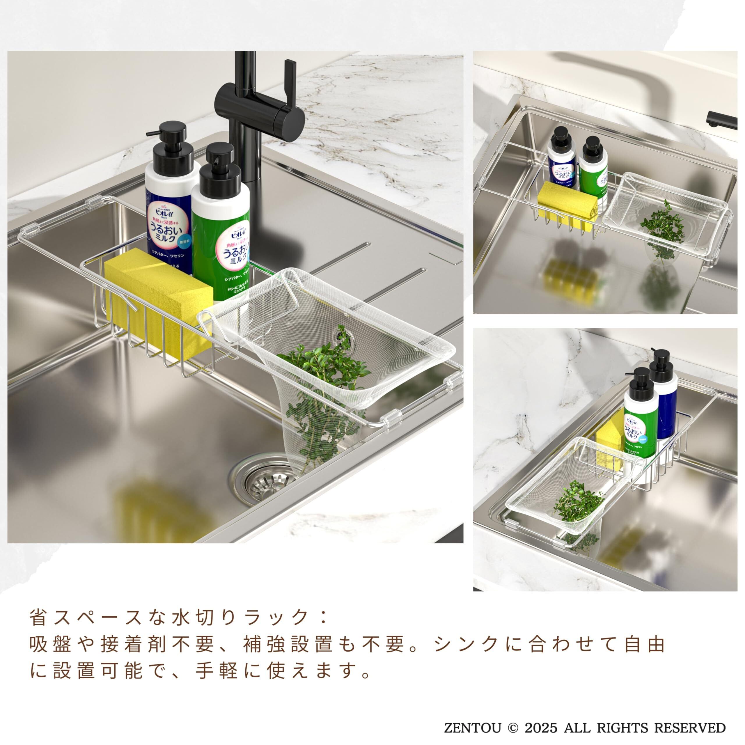 水切りラック 伸縮32〜45cm|狭いシンク対応|三角コーナーいらず&水切りネット・洗剤ラック付き|浮かせるスポンジホルダー|吸盤不要・簡単設置|防錆ステンレス|ネット50枚付