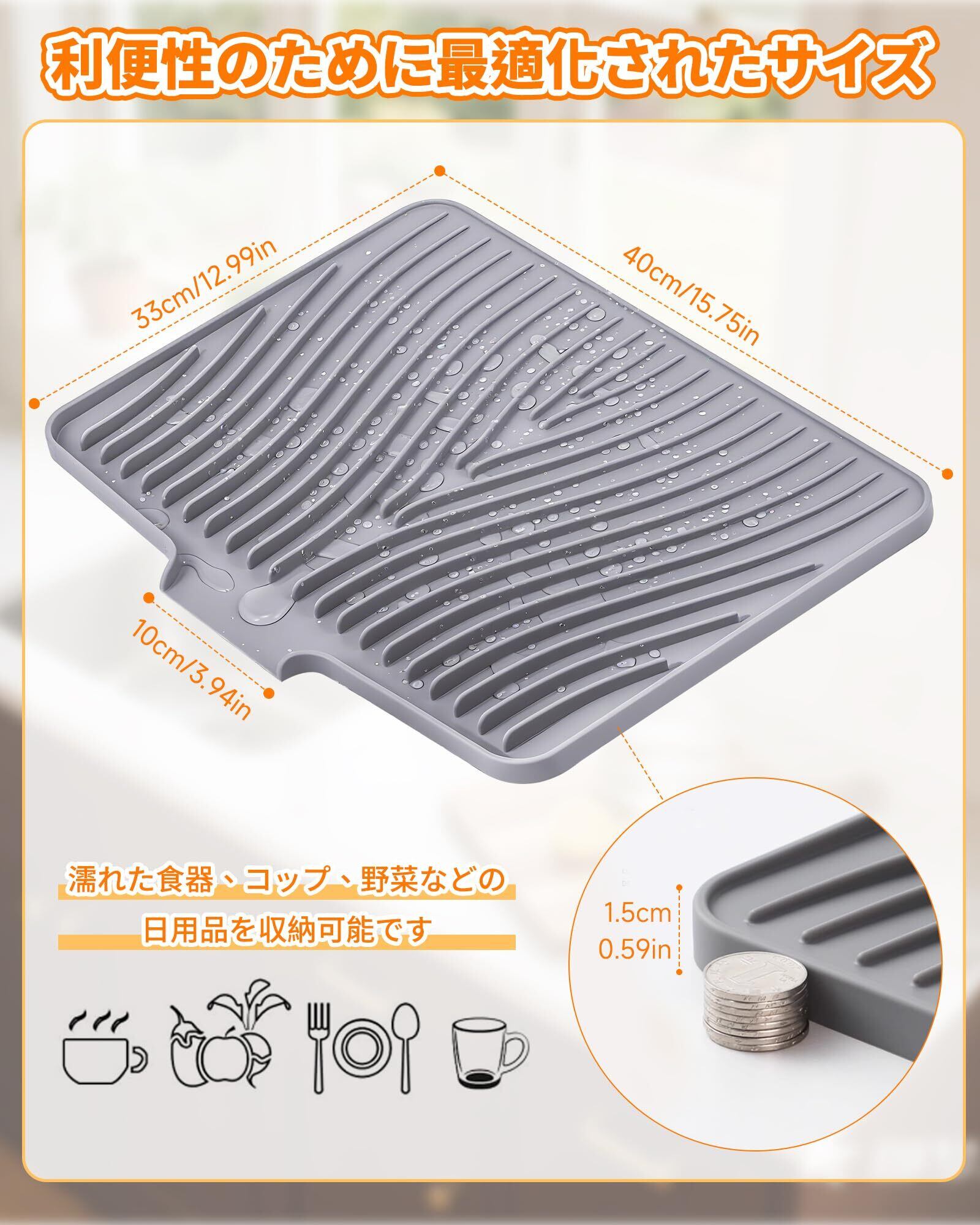 食器 水切りマット: 滑り止め効果で、カトラリー、野菜、果物、ガラス食器が滑り落ちるのを防ぎます。 また、耐熱性に優れたシリコーン製食器洗いマットで、-5 °Cから230 °Cまでの温度に耐えることができ、熱い鍋や電化製品からカウンタートップやテーブルを保護します。