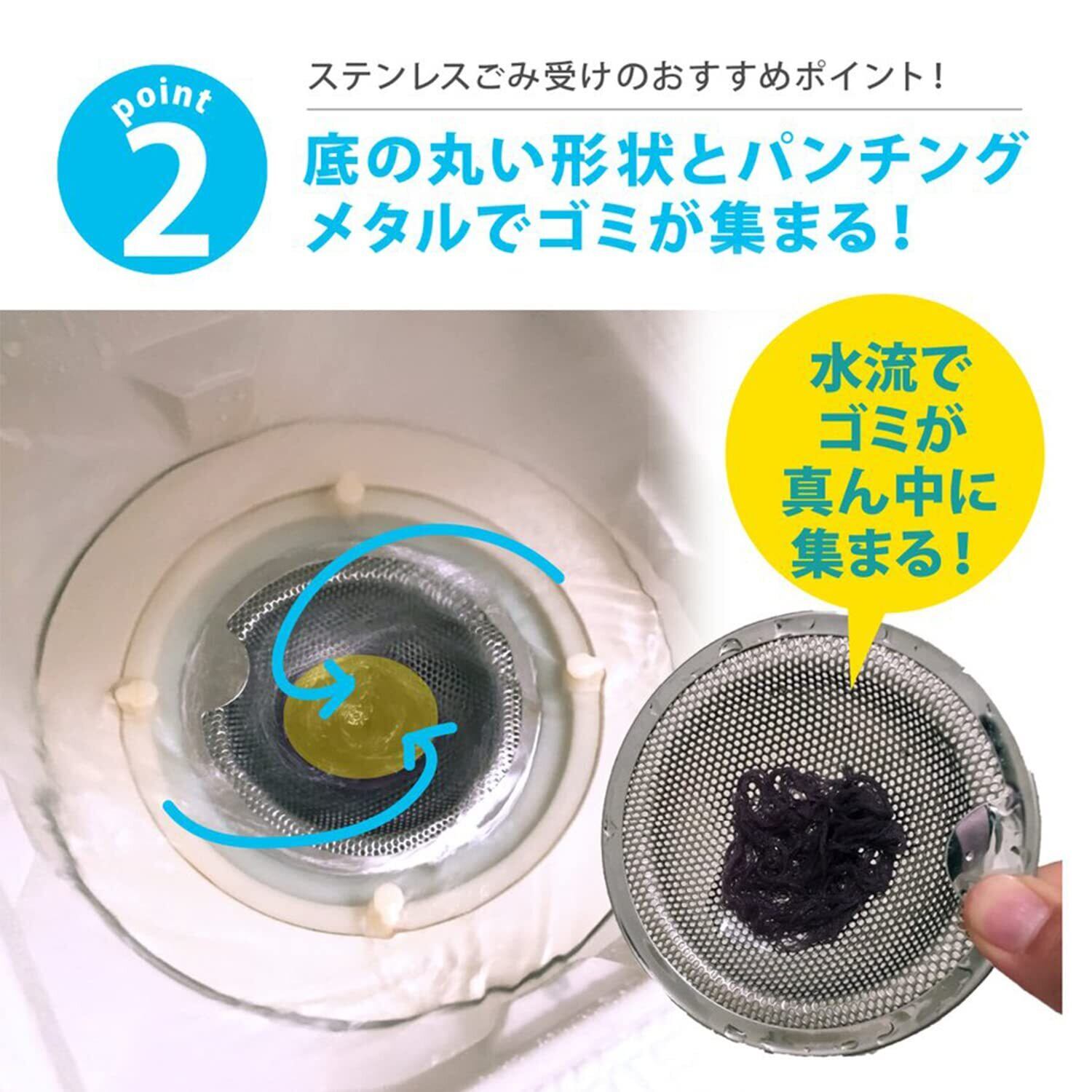 ■細かいゴミもしっかりキャッチ!■ 素材には、錆に強く耐久性に優れたステンレスを使用しています。 ごみ受け部分は精密なパンチング設計で、細かなごみもしっかりとキャッチできます。キッチンや流し台をはじめ、バスルーム、洗面台などの排水口にもおすすめです。