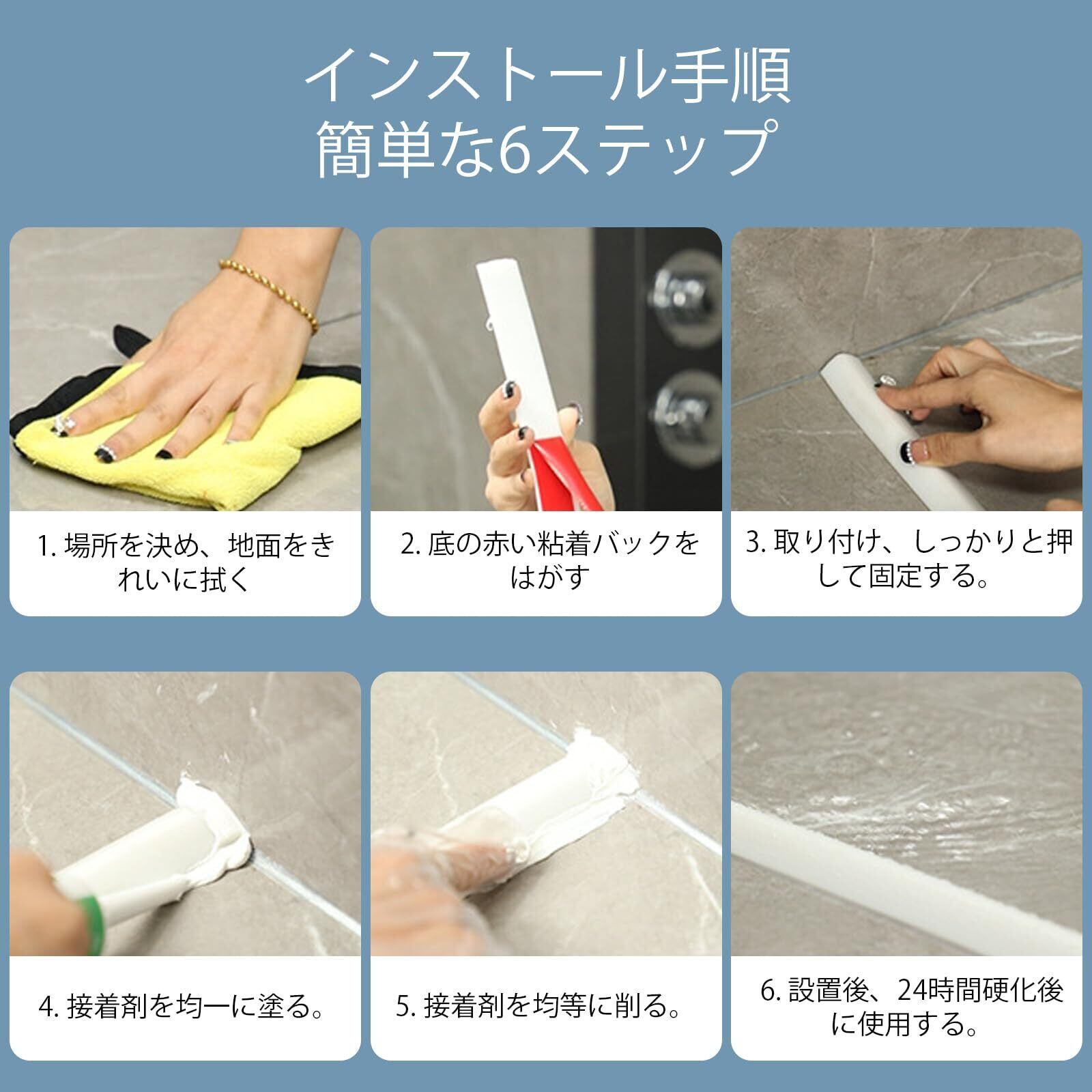 【定期的に交換】粘着式のスプラッシュガードストリップは、床を乾燥した状態に保ち、防水性と防塵性を保つための交換品として使用できます。定期的に点検し、交換することで、バスルームを清潔に保つことができます。