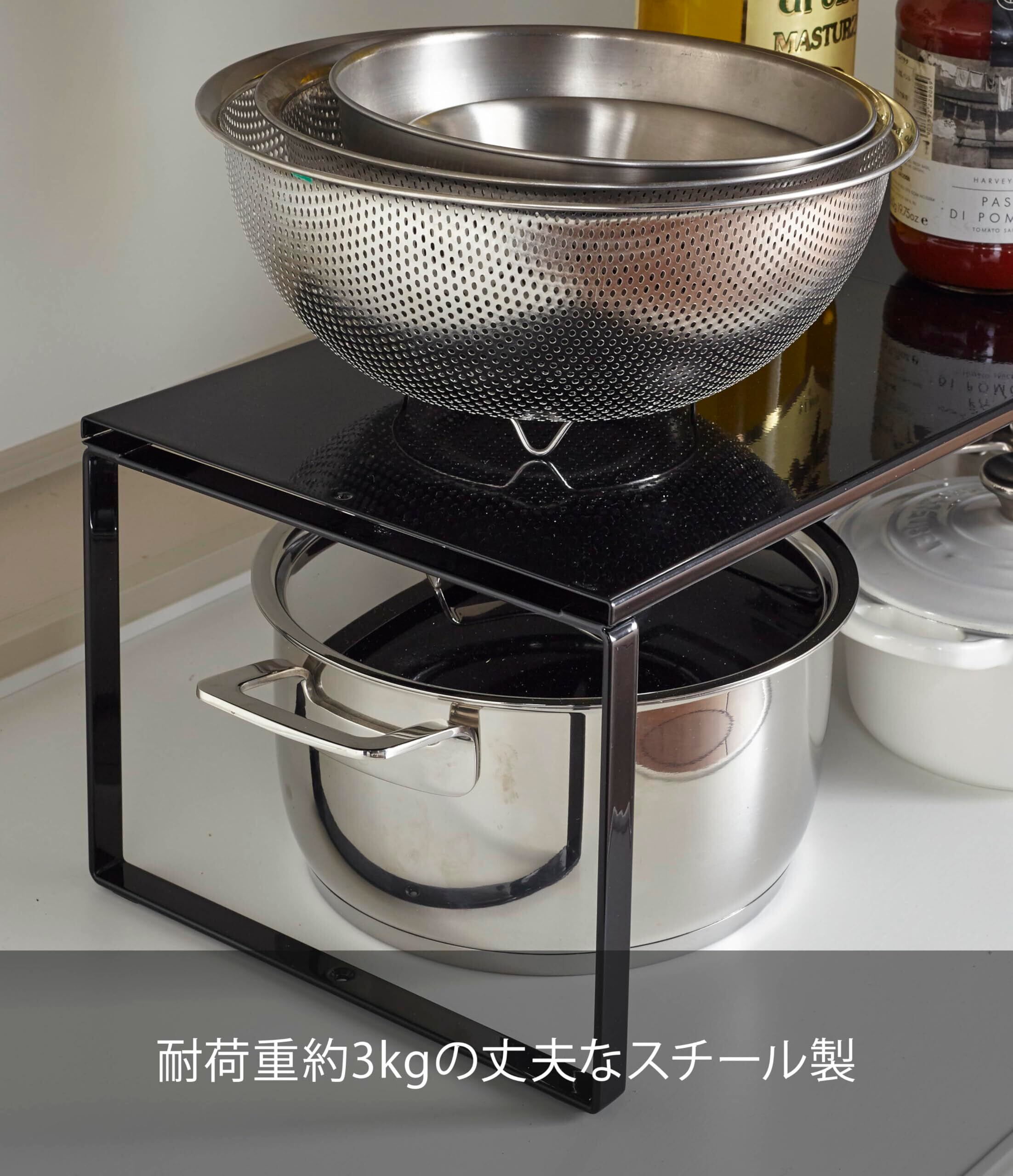 スタイリッシュなtowerアイアンシリーズの伸縮収納棚。 幅を伸縮できるので、キッチンやシンク下の収納に最適。 スタッキングをすれば収納力がアップします。 ホワイト・ブラックの2色からお選びいただけます。 ・置く場所に合わせて横幅を36.5~60cmに伸縮できるデザイン。 ・キッチンカウンターで、調味料などの収納に。 ・シンク下で、鍋などの収納に。 ・スタッキング(積み重ね)可能なデザインで、収納力がアップします。 ・耐荷重は3kg。鍋やフライパンなどの大きなものから、調味料やラップなどの小さなキッチン小物まで収納できます。 ・ホワイト・ブラックの2色からお選びいただけます。