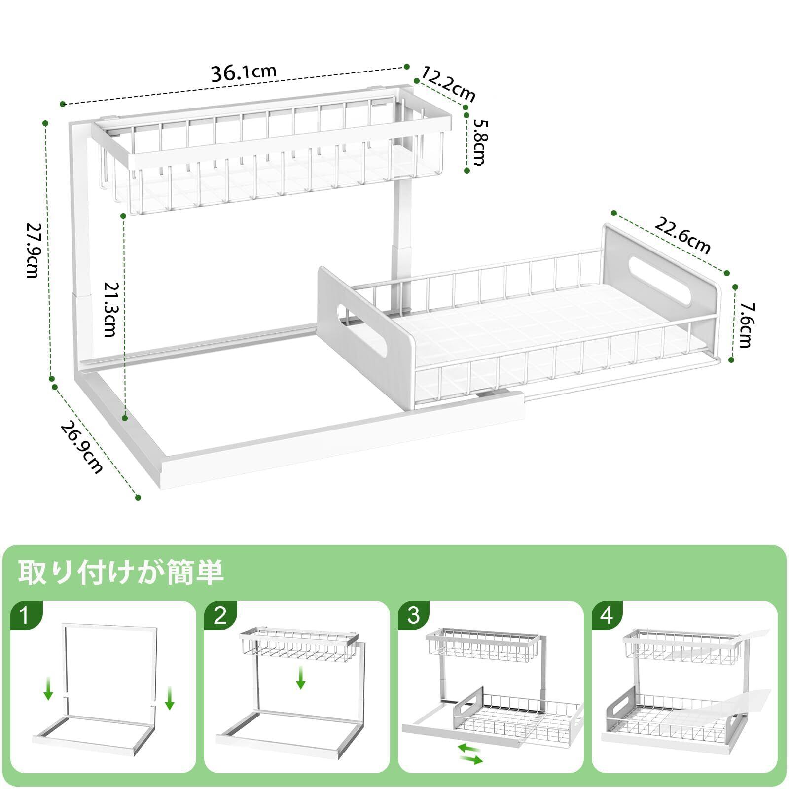 【簡単組立】スライドラックの組み立ては非常に簡単で、ツールを使用する必要はありません。ネジを使わずに数秒で取り付けることができ、より安定です。シンク下収納の底には吸盤が付いており、滑らせることなく特定の位置に固定できます。