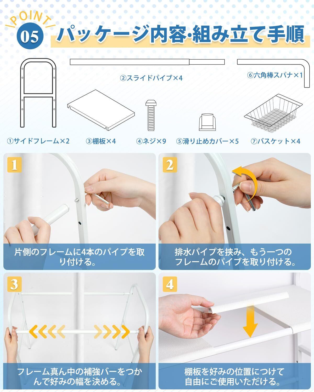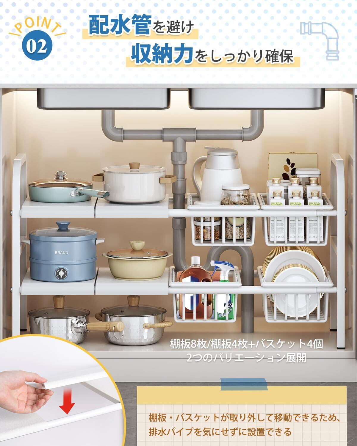 【商品仕様、様々なシーンで活躍】■素材:棚板・フレーム:PP 本体:炭素鋼 粉体塗装 汚れたときは濡れた布で軽く拭くだけでお手入れ楽ちん。■サイズ:幅53-88×奥行25.5×高さ49cm 総重量(約):2.24kg ■パッケージ内容(棚板4枚+バスケット4個バージョン):本体、棚板4枚、バスケット4個、説明書。シンク下収納のほか、洗面台の下収納、キッチン収納など、お好みに合わせて使用することができ、用途無限大