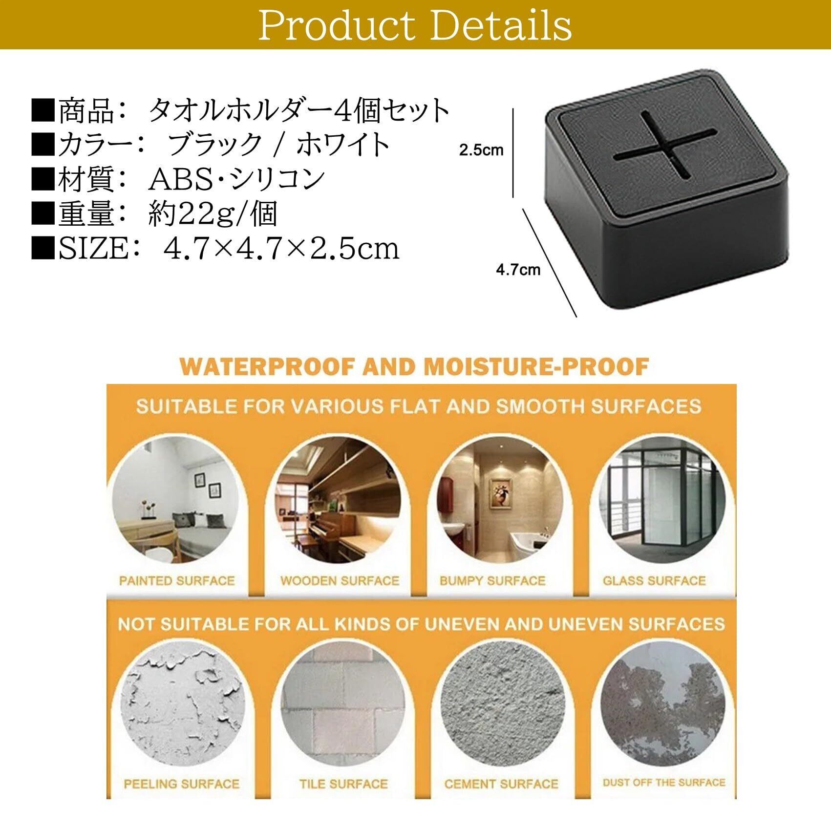 商品詳細:タオルホルダー4個セット 【カラー】 ブラック/ホワイト 【材質】 ABS・シリコン 【重量】 約22g/個 【サイズ】 4.7×4.7×2.5㎝