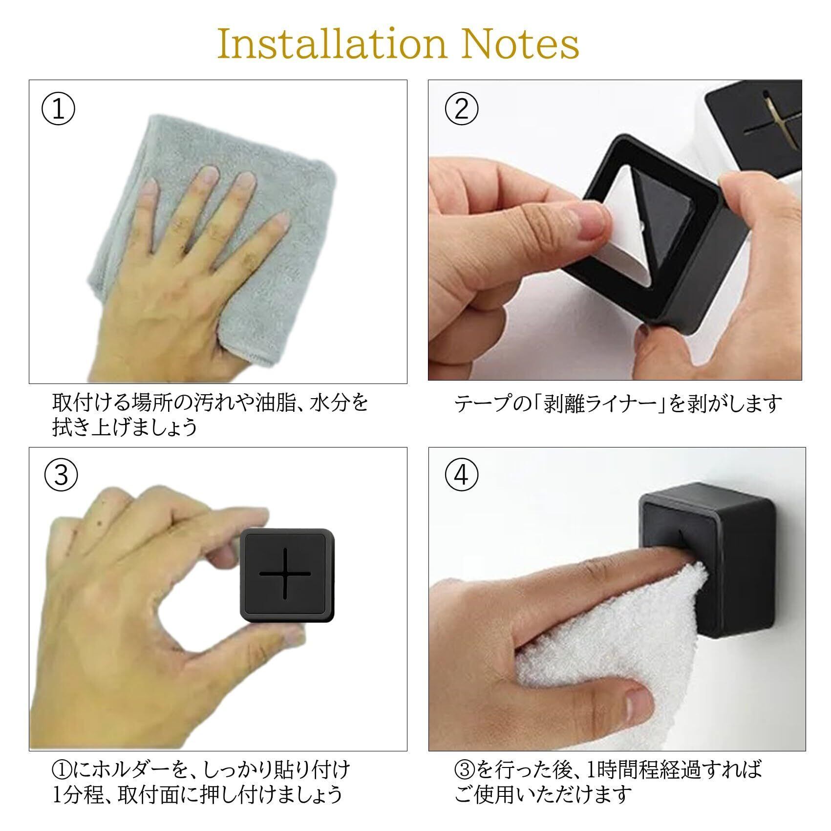 【取付け方法】 ①取付ける場所の汚れや油脂、水分を拭き上げましょう。 ②本体背面強力テープの「剥離ライナー」を剥がします。 ③①にホルダーをしっかり貼り付け、約1分程、取付面に押し付けましょう。 ④③を行った後、1時間程経過すれば、しっかり貼り付きご使用いただけます。