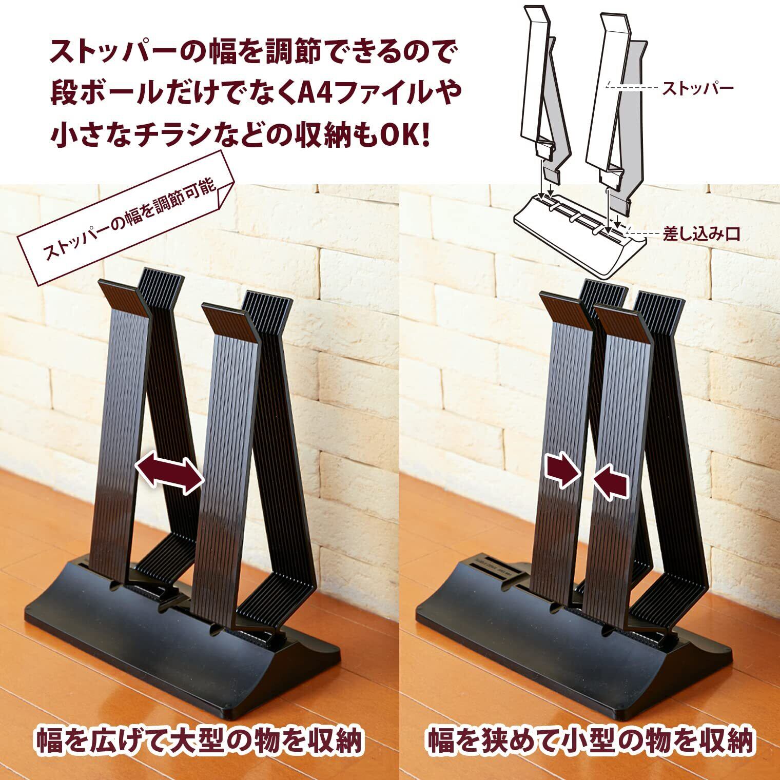 家庭内で増えている段ボールの一時保管に便利なストッカー(リサイクル材料使用)。 空き段ボールをたたんで差し込むだけで一時保管できます。 紐が掛けやすいよう、段ボールの下にスペースができる設計になっています。 支柱の位置を変えることで、チラシや紙バッグなどの小さなものも保管できます。 SDGs(目標12-5:再利用により廃棄物の発生を大幅に削減)を実行する、リサイクル材料使用の地球に優しい商品。