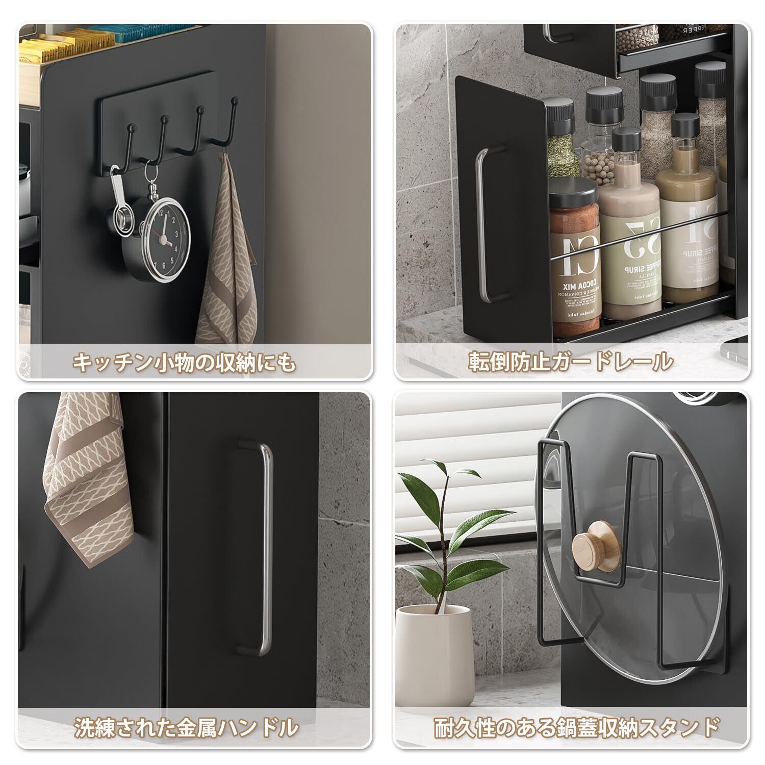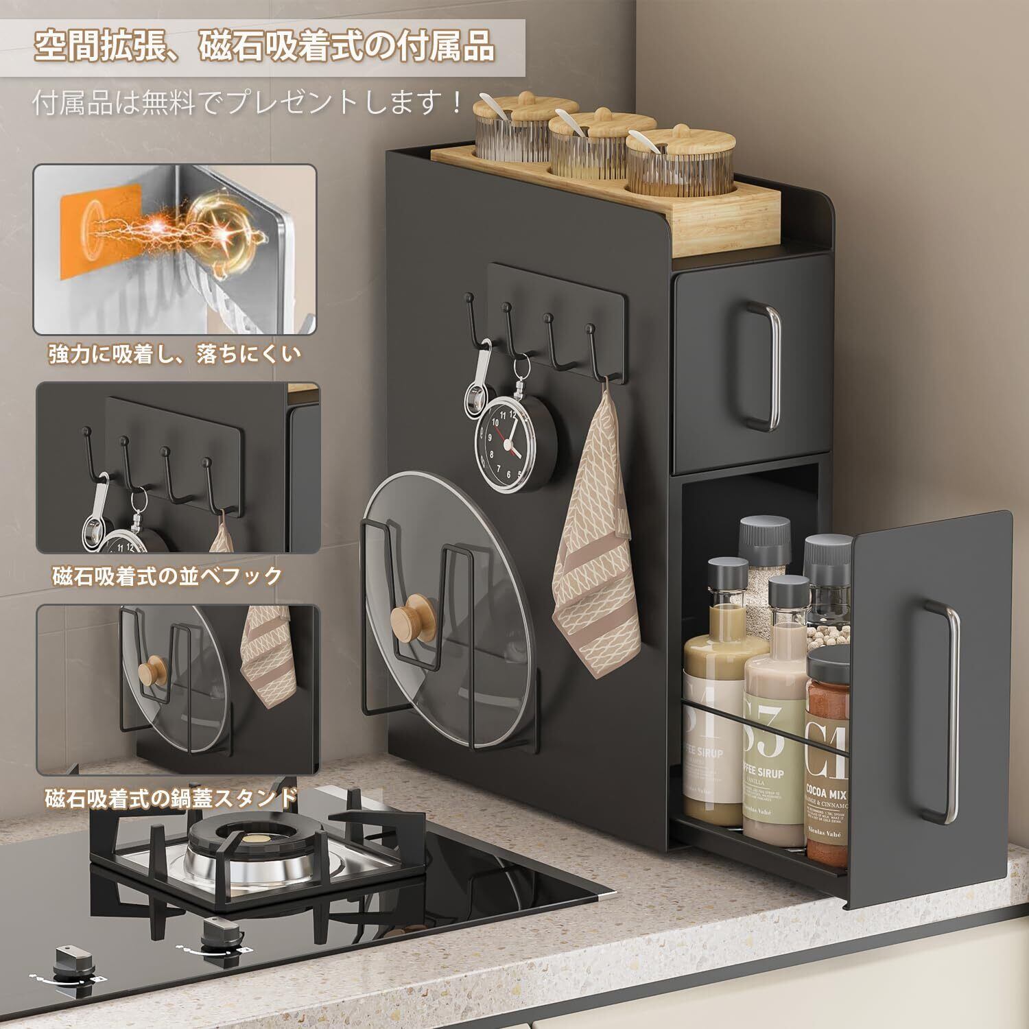 【引き出し式デザイン】調味料棚はスライド式デザインなので、ものを取り出す時は軽く引き出すだけ、スムーズで滑らかです。引き出し部分は取り外し可能、内側の汚れを清潔しやすくなり、日々のお手入れがずっと楽になります。引き出しやすい細いシルバー取っ手。細くて、埃が溜まりにくい設計です。